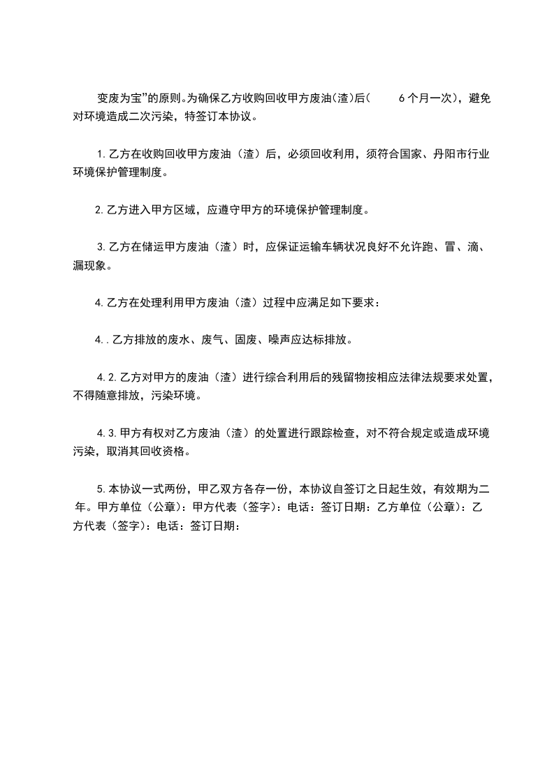 变废为宝”的原则。为确保乙方收购回收甲方废油(渣)后(6个月一次),避免对环境造成二次污染,特签订本协议。
