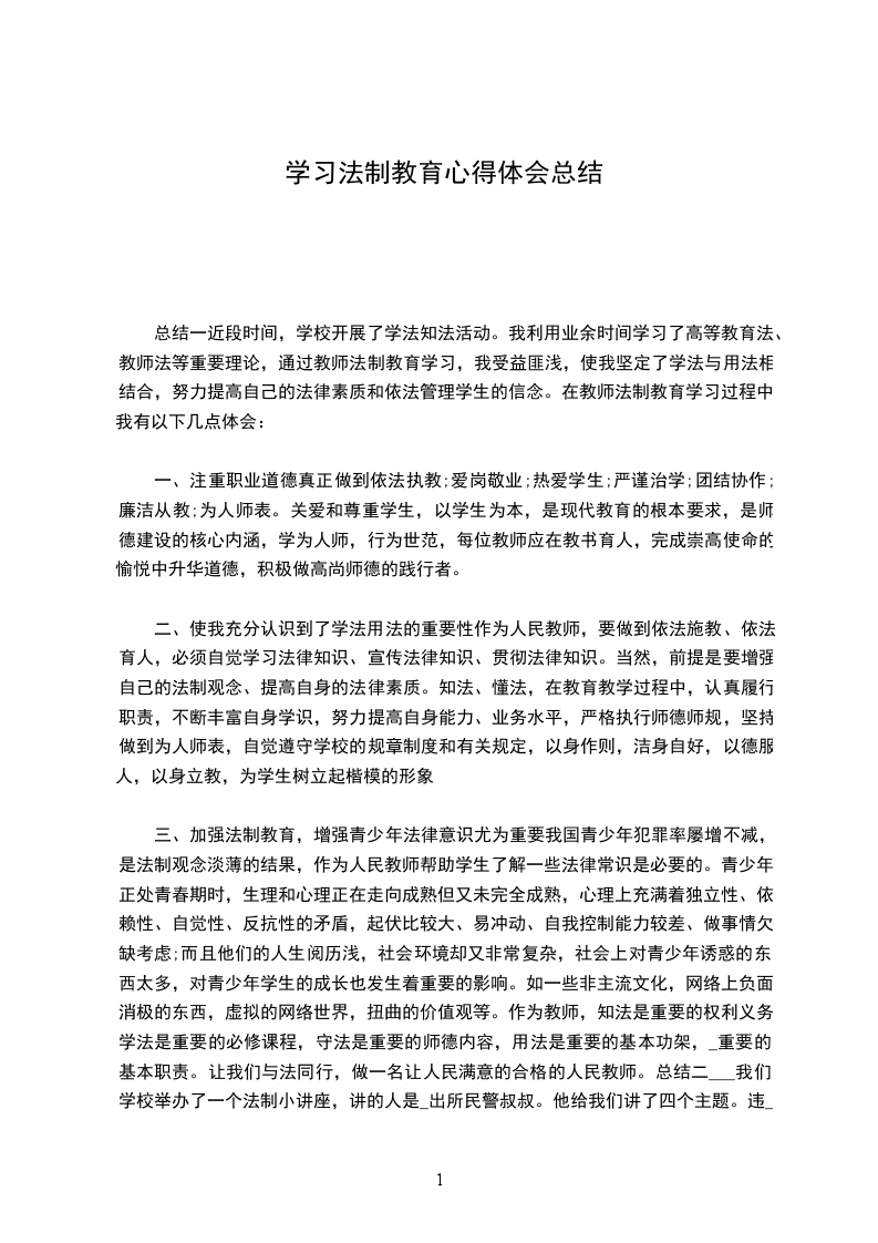 三、加强法制教育,增强青少年法律意识尤为重要我国青少年犯罪率屡增不减,是法制观念淡薄的结果,作为人民教师帮助学生了解一些法律常识是必要的。青少年正处青春期时,生理和心理正在走向成熟但又未完全成熟,心理上充满着独立性、依赖性、自觉性、反抗性的矛盾,起伏比较大、易冲动、自我控制能力较差、做事情欠缺考虑;而且他们的人生阅历浅,社会环境却又非常复杂,社会上对青少年诱惑的东西太多,对青少年学生的成长也发生着重要的影响。如一些非主流文化,网络上负面消极的东西,虚拟的网络世界,扭曲的价值观等。作为教师,知法是重要的权利义务,学法是重要的必修课程,守法是重要的师德内容,用法是重要的基本功架,_重要的基本职责。让我们与法同行,做一名让人民满意的合格的人民教师。总结二___我们学校举办了一个法制小讲座,讲的人是_出所民警叔叔。他给我们讲了四个主题。违_的行为不尊重他人的行为消极悲观的行为不道德的行为这四个主题。我从叔叔的口中知道。这是耳熟能详的三国演义中刘备去世前给其子刘X的遗言,劝勉他要进德修业,有所作为。好事要从小事做起,积小成大,也可成大事;坏事也要从小事开始防范,否则积少成多,也会坏了大事。所以,不要因为好事小而不做,更不能因为不好的事小而去做。人要会勤俭劳德,做人首先要有品德,除了从父母老师和书本中学习做人的道理以外,我们还要多学法律常识。只有明确什么事情能够做,什么事情不可以做,才能心中有把握,才能做好事情,得到他人的认可和尊重,做一个以德服人的人。我们还要做到下面几点:1.珍惜学习机会。盛年不重来,一日难再晨。及时当勉励,岁月不待人。