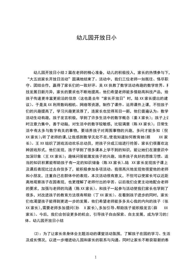 幼儿园开放日小结2篇在老师的精心准备,幼儿的积极投入,家长的热情参与下,“大五班家长开放日活动”圆满地结束了。活动中,我们三位老师一如既往、恪尽职守、团结合作,赢得了家长们的一致好评。吴XX执教了数学活动有趣的数学世界。科技发展日新月异,家长的要求也不断地提高。他们希望老师能多借助高科技产品,给孩子传递更丰富更前沿的信息(这也是去年“家长开放日”时,陆XX家长提出的建议)。于是吴XX利用数码相机、网络等资源,制作了课件。运用课件上课,不但孩子们的兴趣提高了,学习兴趣更浓厚了,连家长也觉得耳目一新,他们普遍认为:数学活动生动有趣,孩子发言积极,学到了许多生活中的数字概念(姜X家长);孩子上课时注意力集中,善于动脑,对生活中的数字较敏感,比较满意(陈XX家长);日常生活中有太多与数字有关的事物,要培养孩子对周围事物的兴趣,多问才能多知(倪XX家长);听了老师的课,让我感到数学无处不在,使我知道如何教育她(顾XX家长)。王XX组织了游戏活动欢乐总动员,把孩子分成三组进行抢答。家长们很喜欢这种游戏形式,他们发现,孩子学到了很多课本上学不到的知识,能让她们在潜意识中加深印象(王XX家长);趣味问答能激发孩子的兴趣,培养孩子良好的思维习惯。适当的知识积累能帮助孩子有一定的知识储备(陈XX家长)。陆XX家长发现孩子课上及课后表现比过去自信多了,能积极参加各项活动。我很高兴地发现他很爱他的老师和小朋友,注重自己在群体中的表现。本次活动很有意义,不但可以使家长可以近距离地观察孩子在园表现,也更理解了老师付出的辛苦。以后我们会更主动地配合老师的要求,加强与老师的沟通(陈XX家长)。和孩子一起参与活动使我们家长也学到了很多,对改进孩子的教育方法很有帮助(丁XX家长)。在看到孩子进步的同时,家长们也渴望孩子能得到更进一步的发展。他们希望老师能多多关心我的内向的孩子(张XX家长),需要老师多加提问(孙X家长),多加引导、帮助孩子能积极发言(薛XX家长)。今后,我们会创设更多的机会,引导孩子自由探索、自主发展,成为学习的主体。幼儿园开放日小结