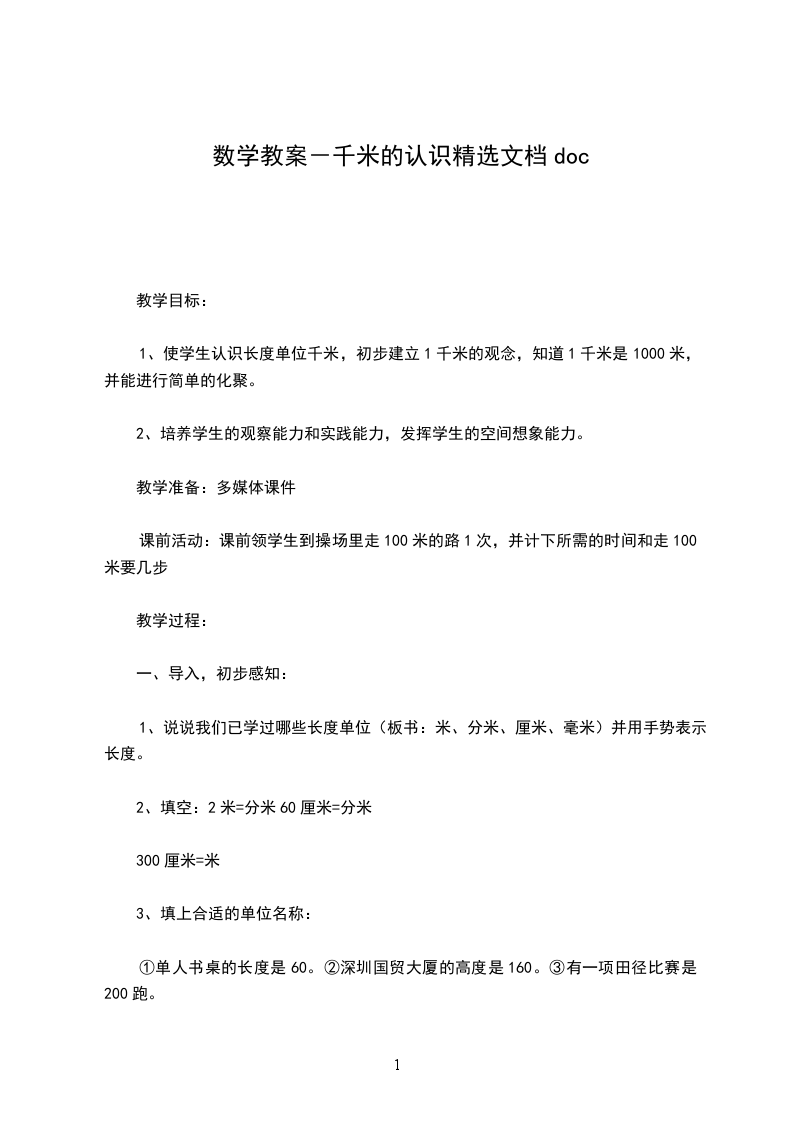 1.知道千米=000米,会用千米和米的简单换算。