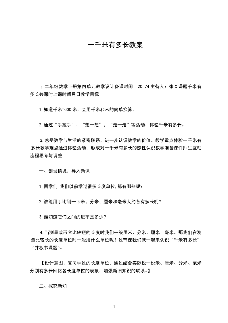 3.感受数学与生活的紧密联系,进一步认识数学的价值。教学重点体验一千米有多长教学难点通过体验活动,形成对一千米有多长的感性认识教学准备课件师生互动流程思考与调整