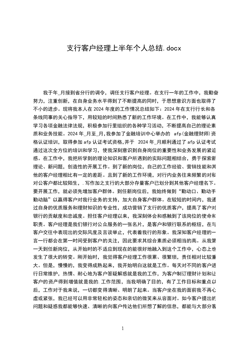 我于年_月接到省分行的调令,调任支行客户经理。在支行一年的工作中,我勤奋努力,注重创新,在自身业务水平得到了不断提高的同时,于思想意识方面也取得了不小的进步。现将我本人在2024年度的工作情况总结如下:2024年在支行行长和各条线同事的关心指导下,用较短的时间熟悉了新的工作环境。在工作中,我能够认真学习各项金融法律法规,积极参加行里组织的各种学习活动,不断提高自己的理论素质和业务技能。2024年_月至_月,我参加了金融培训中心举办的afp(金融理财师)资格认证培训,取得参加afp认证考试资格,并于2024年_月顺利通过了afp认证考试。通过这次全方位的培训和学习,使我深刻意识到自身岗位的重要性和业务发展的紧迫感。在工作中,我把所学到的理论知识和客户所遇到的实际问题相结合,勇于探索新理论、新问题,创造性的开展工作。到了新的岗位,自己的工作经验、营销技能和其他的客户经理相比有一定的差距。且到了新的工作环境,对行内业务往来频繁的对私对公客户都比较陌生,.写作加之支行的大部分存量客户已划分到其他客户经理名下。要开展工作,就必须先增加客户群体。到任新岗位后,我始终做到“勤动口、勤动手、勤动脑”以赢得客户对我行业务的支持,加大自身客户群体。在较短的时间内,我通过自身的优质服务和理财知识的专业性,成功营销了支行的优质客户,提高了客户对银行的贡献度和忠诚度。担任客户经理以来,我深刻体会和感触到了该岗位的使命和职责。客户经理是我们银行对公众服务的一张名片,是客户和银行联系的枢纽,在与客户交往中表现出的交际风度及言谈举止,代表着我行的形象。我深知客户经理的一言一行都会在第一时间受到客户的关注,因此要求其综合素质必须相当的高。从我第一天到任新岗位,从开始时的不适应到现在的能很好地融入到这个工作中,心态上也发生了很大的转变。刚开始时,我觉得客户经理工作很累、很繁琐,责任相对比较重大。但是,慢慢的,我变得成熟起来,我开始明白这就是工作。每天对不同的客户进行日常维护,热情、耐心地为客户答疑解惑就是我的工作,为客户制订理财计划和让客户的资产得到增值就是我的.工作范围,当我明确了目的,有了工作目标和重点以后,工作对于我来说,一切都变得清晰、明朗了起来。当客户坐在我的面前我不再心虚或紧张,我已经可以用非常轻松的姿态和亲切的微笑来从容面对。如今客户提出的问题和疑惑我都能够快速、清晰的向客户传达他们所想了解的信息,都能与大部分客户进行良好的沟通并取得很好的效果,从而赢得了客户对我工作的普遍认同。同时,在和不同客户的接触中,也使我自身的沟通能力和营销技巧得到了很大的提高。存在的主要问题:一、金融专业知识有待进一步加强。面对如今市场经济的多样性,银行理财成为越来越多客户的需求,如何能给我行优质客户提供专业的金融信息和理财产品,这就需要提高自身的学习能力和学习主动性,及时掌握财经信息和准确分析未来的经济走势,以提高自身金融专业知识水平;