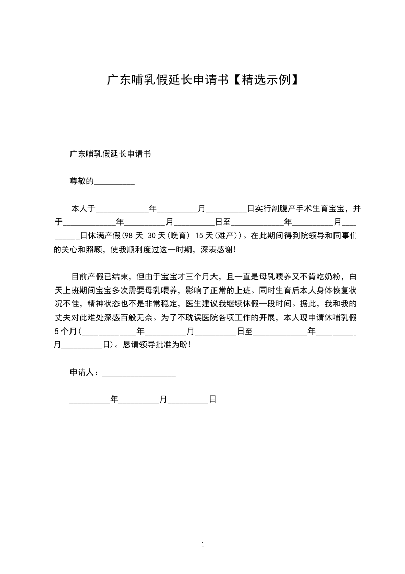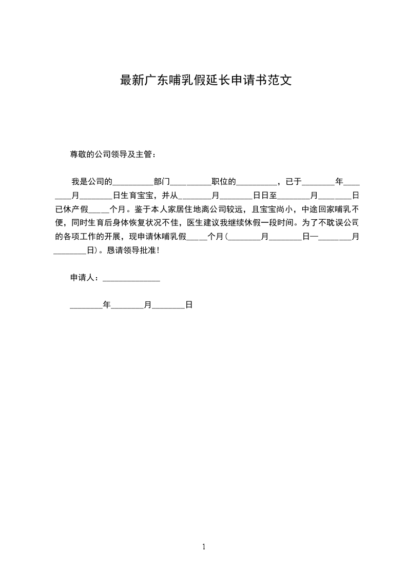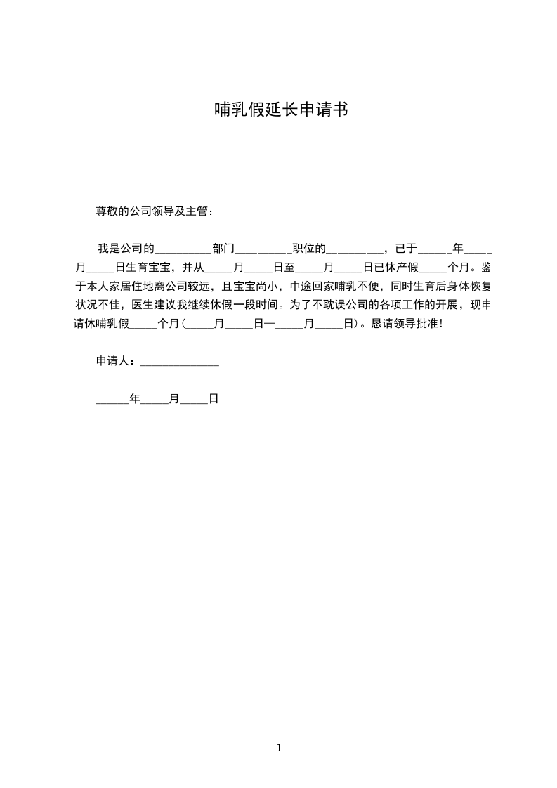 我是公司的__________部门__________职位的__________,已于________年________月________日生育宝宝,并从________月________日日至________月________日已休产假_____个月。鉴于本人家居住地离公司较远,且宝宝尚小,中途回家哺乳不便,同时生育后身体恢复状况不佳,医生建议我继续休假一段时间。为了不耽误公司的各项工作的开展,现申请休哺乳假_____个月(________月________日—________月________日)。恳请领导批准!