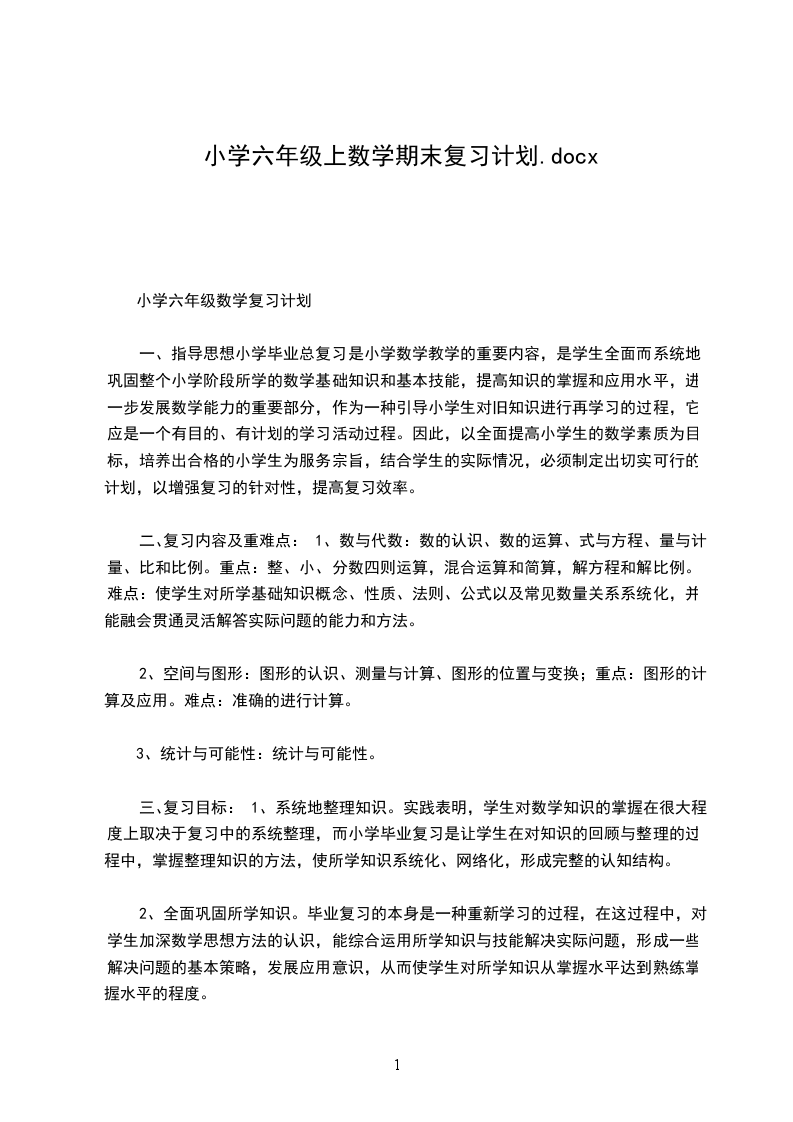一、指导思想小学毕业总复习是小学数学教学的重要内容,是学生全面而系统地巩固整个小学阶段所学的数学基础知识和基本技能,提高知识的掌握和应用水平,进一步发展数学能力的重要部分,作为一种引导小学生对旧知识进行再学习的过程,它应是一个有目的、有计划的学习活动过程。因此,以全面提高小学生的数学素质为目标,培养出合格的小学生为服务宗旨,结合学生的实际情况,必须制定出切实可行的计划,以增强复习的针对性,提高复习效率。