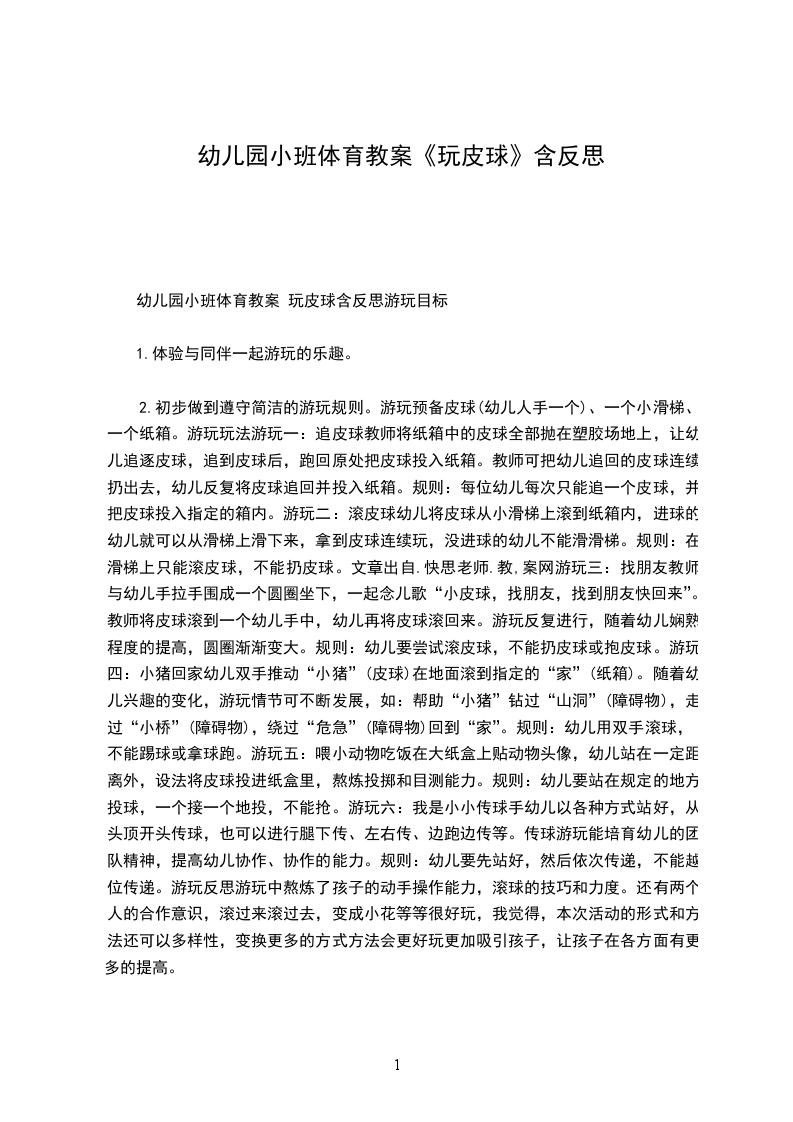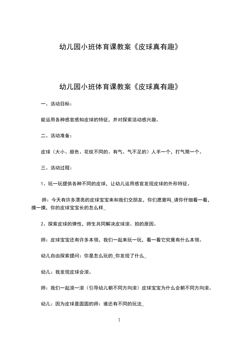 五、课后延伸小皮球真可爱,我们小朋友肯定还想和它一起玩了。小皮球呢也想和小朋友一起玩,那别忘了平时去拍一拍它哦。附儿歌小皮球小皮球,圆又圆,拍一拍,跳一跳。拍得重,跳得高,拍得轻,跳得低,乐得大家哈哈笑。皮球的分类分真皮球,橡胶球、Pu球和PVC球。真皮球是一种材质的球,适合在木地板上打,具有弹性好的特点,真皮球清洁时请勿用湿布擦拭,并要存放在阴凉干燥的地方,以防发霉。