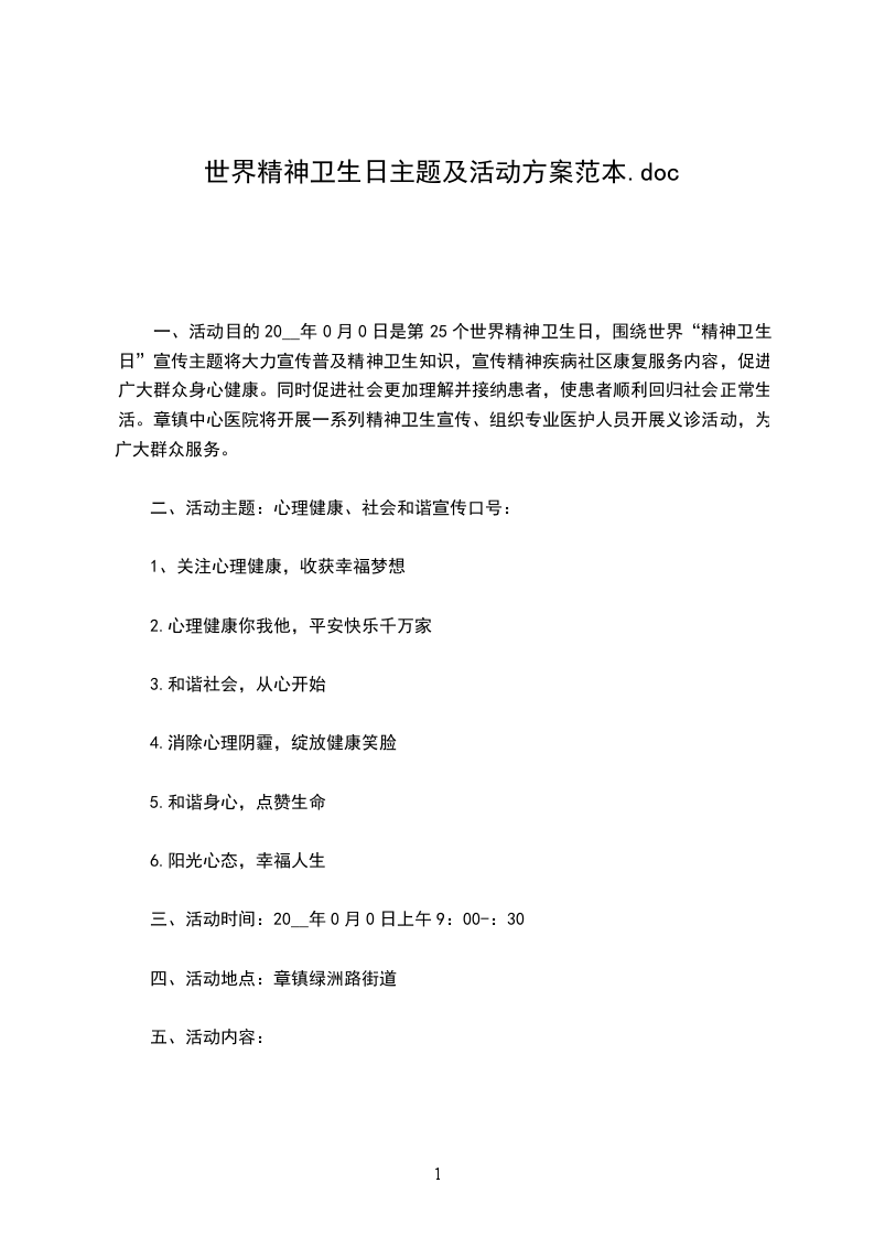 一、活动目的20__年0月0日是第25个世界精神卫生日,围绕世界“精神卫生日”宣传主题将大力宣传普及精神卫生知识,宣传精神疾病社区康复服务内容,促进广大群众身心健康。同时促进社会更加理解并接纳患者,使患者顺利回归社会正常生活。章镇中心医院将开展一系列精神卫生宣传、组织专业医护人员开展义诊活动,为广大群众服务。