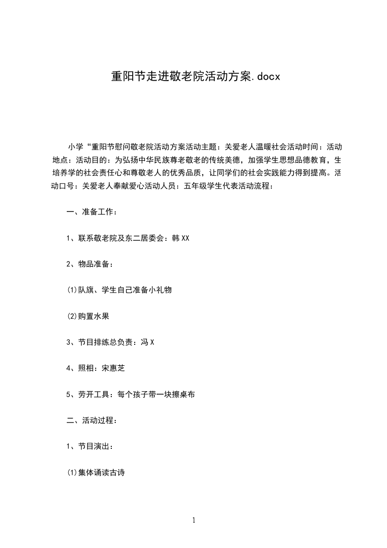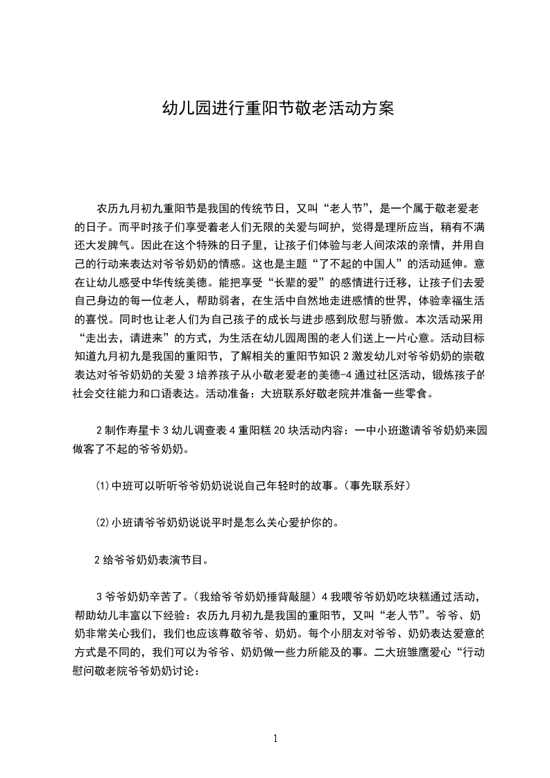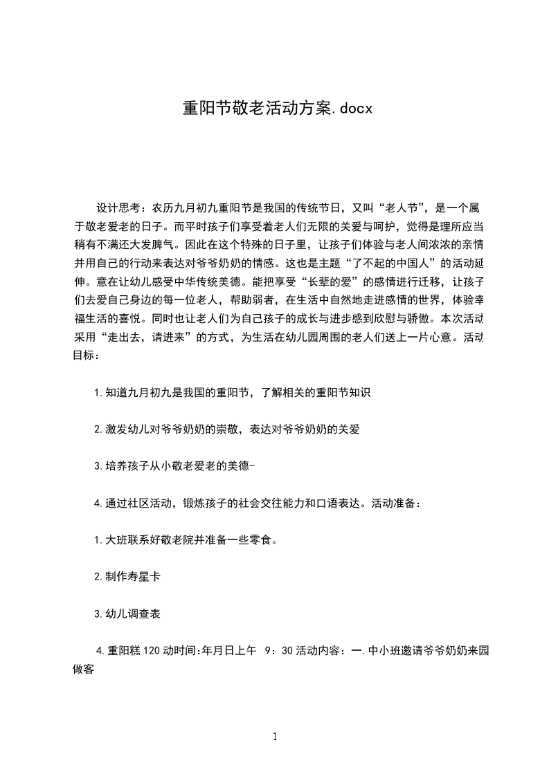 农历九月初九重阳节是我国的传统节日,又叫“老人节”,是一个属于敬老爱老的日子。而平时孩子们享受着老人们无限的关爱与呵护,觉得是理所应当,稍有不满还大发脾气。因此在这个特殊的日子里,让孩子们体验与老人间浓浓的亲情,并用自己的行动来表达对爷爷奶奶的情感。这也是主题“了不起的中国人”的活动延伸。意在让幼儿感受中华传统美德。能把享受“长辈的爱”的感情进行迁移,让孩子们去爱自己身边的每一位老人,帮助弱者,在生活中自然地走进感情的世界,体验幸福生活的喜悦。同时也让老人们为自己孩子的成长与进步感到欣慰与骄傲。本次活动采用“走出去,请进来”的方式,为生活在幼儿园周围的老人们送上一片心意。活动目标:知道九月初九是我国的重阳节,了解相关的重阳节知识2激发幼儿对爷爷奶奶的崇敬,表达对爷爷奶奶的关爱3培养孩子从小敬老爱老的美德-4通过社区活动,锻炼孩子的社会交往能力和口语表达。活动准备:大班联系好敬老院并准备一些零食。