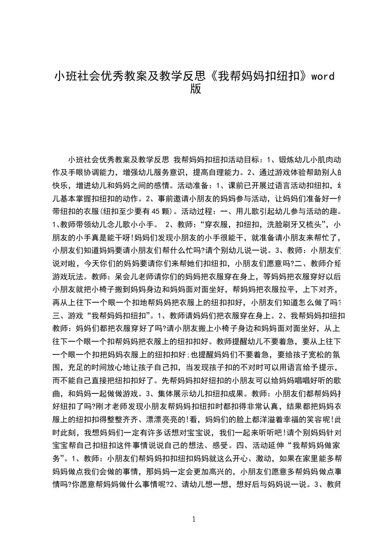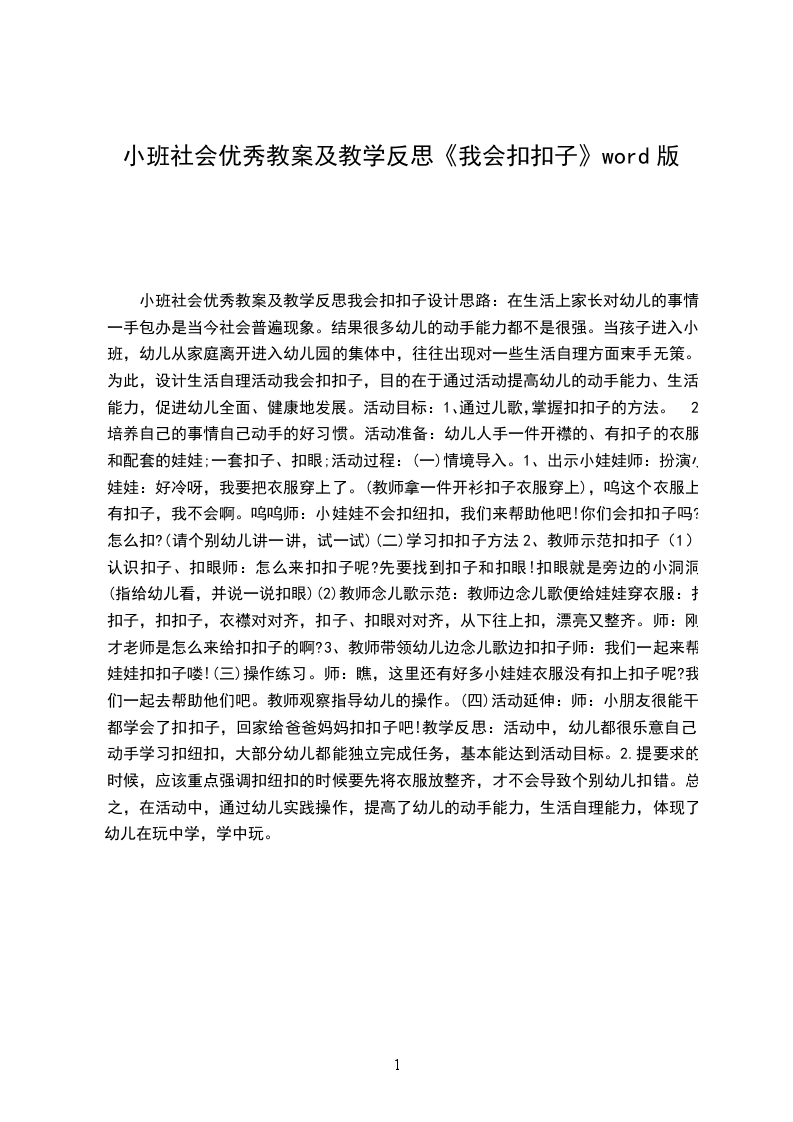 (四)活动延伸:师:小朋友很能干,都学会了扣扣子,回家给爸爸妈妈扣扣子吧!教学反思:活动中,幼儿都很愿意自己动手学习扣纽扣,大部分幼儿都能独立完成任务,基本能达到活动目标。以下是我反思的几点不足: