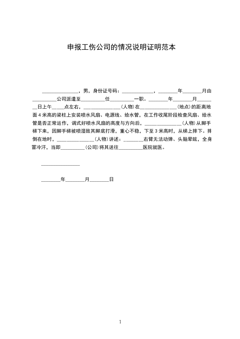 _______________,男,身份证号码:_____________,________年________月由__________公司派遣至__________任__________一职。________年________月________日上午_____点左右,_______________(人物)在_______________(地点)的距离地面4米高的梁柱上安装喷水风扇、电源线、给水管,在工作收尾阶段检查风扇、给水管是否正常运作,调式好喷水风扇的高度与方向后,_______________(人物)从脚手梯下来,因脚手梯被喷湿致其脚底打滑,重心不稳,下至3米高时,从梯上摔下。摔倒在地时,_______________(人物)讲述:________右臂无法动弹、头脑晕眩,全身冒冷汗,当即__________(公司)将其送往__________医院就医。
