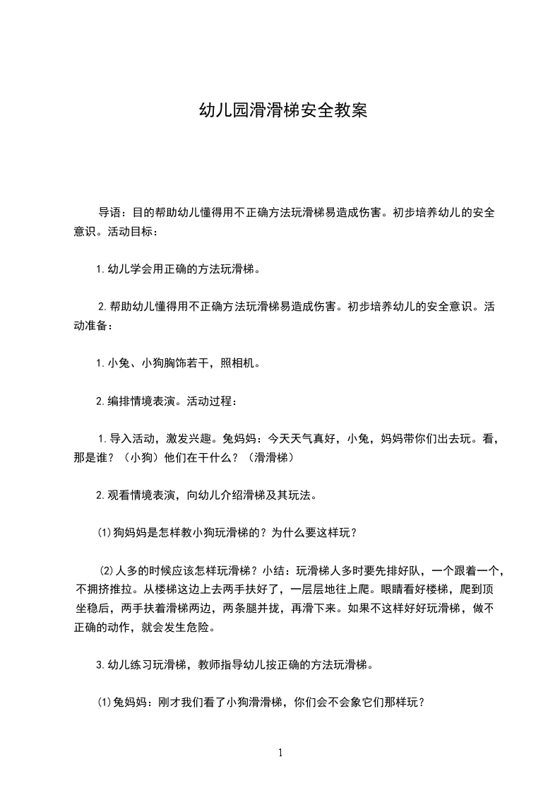 幼儿园滑梯的回忆社会教案背景分析:活动以滑梯的自述引发了幼儿的一系列回忆,这正是幼儿园三年成长的掠影,听着这个故事,幼儿会回想起自己经历过的生活、学习片段,从而使自己对幼儿园的留恋情感体验更具体、更清晰。在日常活动中玩滑梯,教师可以有意识的设问:小班的时候你是怎么玩的?中班的时候,你在这里发生了什么事?让幼儿进行有意义的回忆、联想、体验幼儿园的活动场所和设施给自己带来过的乐趣。本活动的教学目标是:让幼儿从滑梯的回忆中感受到自己在成长,萌发对幼儿园的留念;鼓励幼儿用多种方式表达对滑梯的感激之情。活动_及分析:师:小朋友们,你们玩过滑滑梯吗?幼:玩过。师:你们还记得在小班的时候是怎样玩滑梯的?幼:坐在上面一个个滑下来。幼:要排好队,不推不挤。师:现在你们又是怎样玩滑梯的?幼:还是和以前一样。幼:更懂得了谦让。分析:通过问题:“你们玩过滑滑梯吗?小班时是怎样玩滑梯的?现在又是怎样玩滑梯的?”让幼儿回忆自己在小班和现在玩滑梯时的不同情景。师:小朋友们都记得自己在小班、大班是怎样玩滑梯的,滑梯也记得你们,滑梯还有很多话要对你们说呢,让我们一起来听一听。师:故事中的小不点,在小班时是怎样玩滑梯的?幼:一步一步爬上来,往下一看,那么高,小不点儿哭起来。幼:小不点儿的妈妈上了滑梯,把小不点儿抱在怀里“忽悠悠”滑下来。师:故事中的小不点成了中班的孩子,又是怎样玩滑梯的?幼:每天“蹬蹬蹬”,爬上滑梯,“哧溜”一下滑到底。不滑到满头大汗,他不肯回去。师:到了大班,小不点玩出了什么花样?幼:他说滑梯是直升飞机,一下子就从空中飞下来,他把滑梯当飞船,自己当外星人。师:今天大班的孩子和滑梯怎样说的,滑梯又是怎么想的?幼:滑梯,滑梯,我舍不得你。我要去上小学了。我会非常非常想你。幼:我也会想你。你来滑滑梯,我很快活。滑着、滑着,你从害怕变得大胆。滑着、滑着,你从小不点儿变成大班的孩子。可是,我是滑滑梯,我要留在幼儿园里。这里还有那么多孩子喜欢我。欢迎你以后常回来看我。分析:通过故事滑梯的回忆,让幼儿再次回忆起三年中自己与滑梯间发生的趣事,从害怕、胆怯的小不点到胆大、勇敢的大孩子,滑梯陪伴他们度过了快乐的时光。师:滑梯真好,你们从害怕变得胆大,从小不点变成大班的孩子,它一直陪伴着你们,给了你们那么多的快乐,你们想怎样感谢滑梯?幼:为滑梯清理身上的灰尘。幼:给他画一幅画,作为纪念。师小结:“小朋友们想出了那么多感谢滑梯的办法,有的要给滑梯写信,有的要给滑梯画相,有的要给滑梯送花,有的要给滑梯折东西,有的要对滑梯说祝福的话,有的还要把滑梯打扮的很漂亮为了实现小朋友的这些愿望,老师为小朋友们准备了白纸和彩笔,你们想好了要为滑梯做什么后,就自己去画,可以自己画,也可以和好朋友一起画。”小朋友做的时候可要抓紧时间啊,现在长针指到几,当指到几的时候要做完。老师观察幼儿的操作,帮助遇到困难的孩子,鼓励幼儿与同伴合作,帮助同伴。