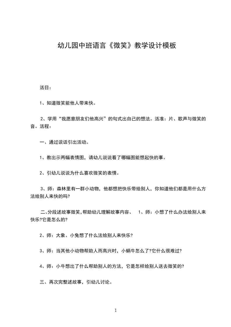 六、情感交流。你们觉得小蜗牛的微笑美吗?那小朋友也来笑一笑,看看自己的微笑美吗?小蜗牛把微笑送给了朋友们,你准备把你的微笑送给谁?为什么呢?那好,我们就来把微笑送给你想送给的人吧。(幼儿互相送微笑,活动自然结束)活动目标: