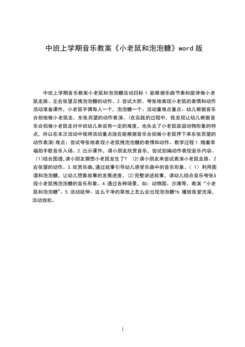 中班音乐游戏教案小老鼠和泡泡糖设计意图:自然界中人与动物的关系是非常亲密的,虽然小老鼠在生活中是人人喊打的动物,但动物王国中的小老鼠却机灵好玩常常引人发笑,深得孩子和成人喜爱。因此我设计了此活动。另外,泡泡糖也是幼儿比较喜欢的糖果之一,对于它的特性很黏、和给人们带来的麻烦有一定得了解,所以本活动设计以生活迁移的方式让活动更贴近幼儿生活,使幼儿的创编表现更自然、丰富,发展幼儿的音乐表现力。活动目标:
