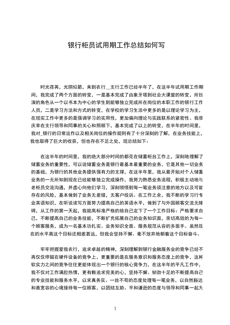 时光荏苒,光阴似箭,来到XXX工作已经半年了,在这半年试用期工作期间,我完成了两个方面的转变,一是基本完成了由象牙塔到.大课堂的转变,所扮演的角色从一个以书本为中心的学生到能够独立完成所在岗位的本职工作的银行工作人员,二是学习方法和方式的转变,在学校的学习生活中更多的是以理论学习为主,在现实工作中更多的是强调学习的实用性,更加偏向理论与实践联系的紧密性。我很庆幸在支行领导和同事的关心和照顾下,基本完成了以上的转变,在半年的时间里,我对_银行的日常运作以及相关岗位的操作规则有了十分深刻的了解,在业务技能上,我也取得了巨大的收获,但也存在不足之处,现总结如下:一、业务技能方面在这半年的时间里,我的绝大部分时间的都花在储蓄柜台工作上,深刻地理解了储蓄业务的重要性,可以说储蓄业务是银行最基本最重要的业务,思想汇报.它是其他一切业务的基础,为银行的其他业务提供强有力的支撑,在这半年里,我从最开始对个人储蓄业务的一无所知到现在已经能够独立完成操作,我努力熟悉业务流程,积极主动地与老柜员交流沟通,并虚心向他们学习,深刻领悟到每一笔业务须注意的地方以及可能存在的风险,基本做到了业务无差错,无客户投诉。在工作之余,我不断的学习行专业英语知识,在听说读写方面努力提高自己的英语水平,做到了与外国顾客交流无障碍,从工作的第一天起,我就高标准严格的给自己定下了一个工作目标:严格要求自己,不断提高自己的业务技能,不断扩充拓展自己的业务知识面,亲切高效的为每一个顾客服务,成为一名基本功扎实、业务知识全面、服务规范从容的多面手。虽然现在的水平离这个目标还相差甚远,但我会坚持不懈、毫不放弃地朝着这个目标奋斗。