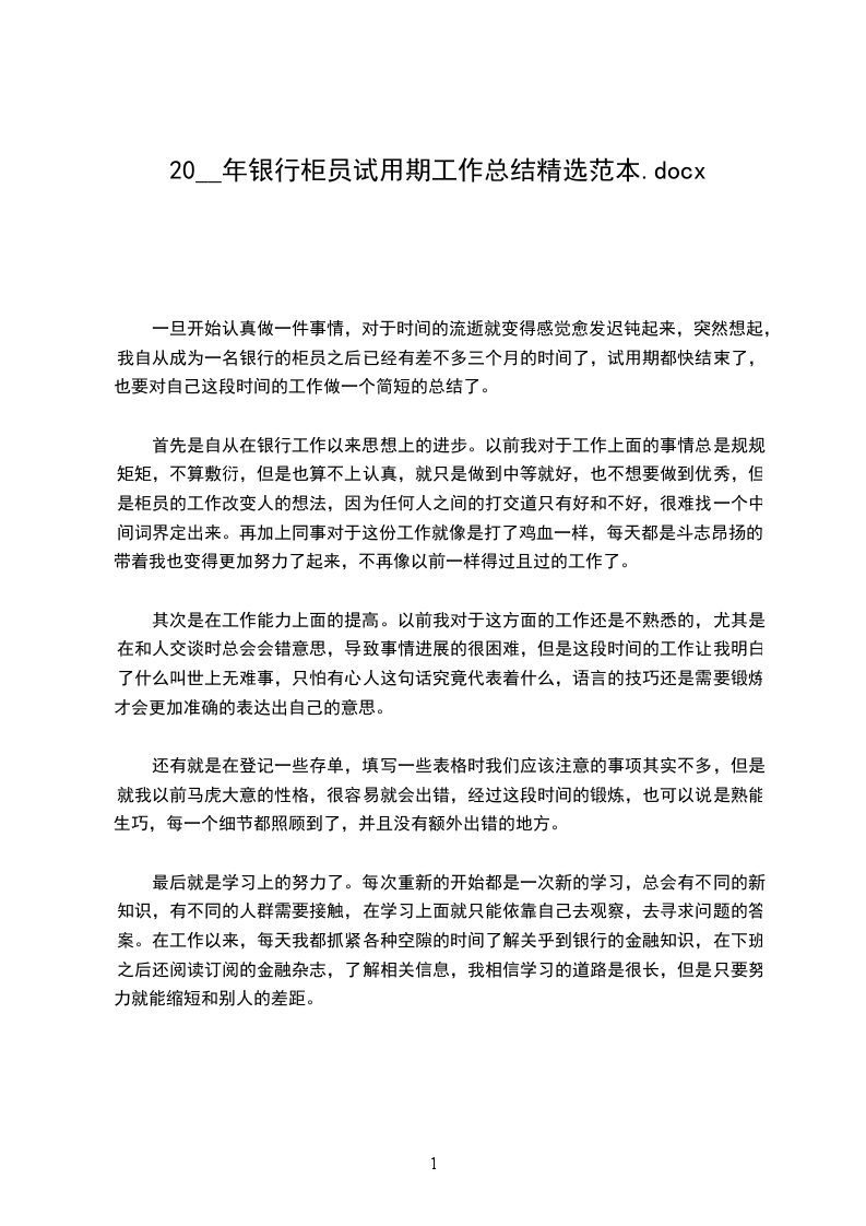 四、在工作生活方面在这半年的工作生活中,我深切地感受到了集体的温暖和力量。心得体会.初来这个城市我,不免有点生疏感,刚离开美好校园的我,也难免有点失落感,是领导和同事给予了我莫大的鼓励,是他们的热情温暖了我,是他们的信任感动了我,是他们的支持激励了我,是他们给予的很多机会锻炼了我,在我们这个集体中,业余生活丰富多彩,极大地增进了我与同行人员的交流、沟通和学习,在此,我真诚的感谢他们。同时,我也感受到了人际交往的重要性,在生活上和同事互帮互助,和谐共处。总之,在这半年的工作中,我学到了很多知识,工作能力有所提高,具备了一定的独立操作业务的能力,但业务知识还不够全面扎实,在今后的工作当中,我会努力克服缺点,发挥自身的优势,为取得更好的工作成绩而努力。2024年银行柜员试用期工作总结1000字