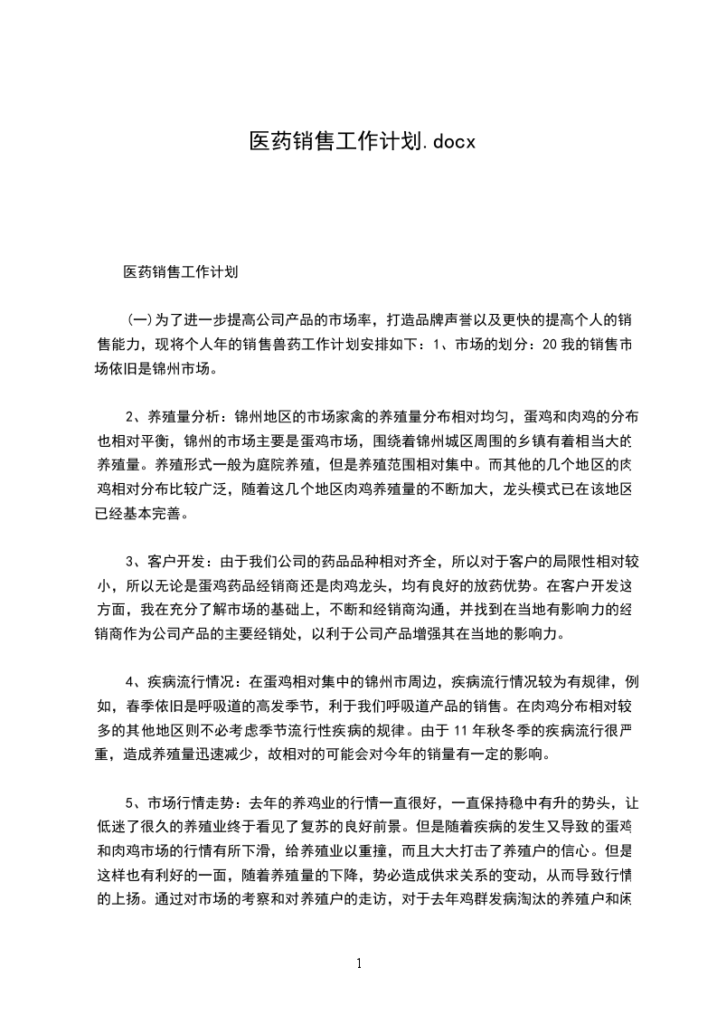 (一)为了进一步提高公司产品的市场率,打造品牌声誉以及更快的提高个人的销售能力,现将个人年的销售兽药工作计划安排如下:1、市场的划分:20我的销售市场依旧是锦州市场。