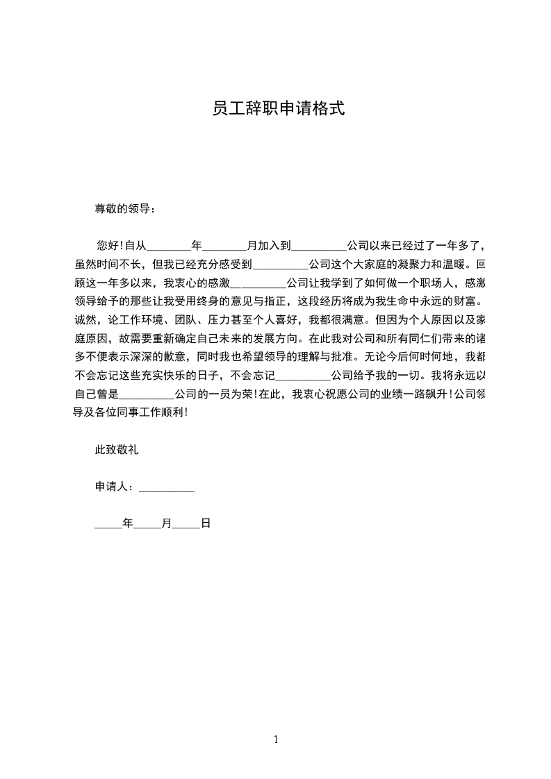 您好!自从________年________月加入到__________公司以来已经过了一年多了,虽然时间不长,但我已经充分感受到__________公司这个大家庭的凝聚力和温暖。回顾这一年多以来,我衷心的感激__________公司让我学到了如何做一个职场人,感激领导给予的那些让我受用终身的意见与指正,这段经历将成为我生命中永远的财富。诚然,论工作环境、团队、压力甚至个人喜好,我都很满意。但因为个人原因以及家庭原因,故需要重新确定自己未来的发展方向。在此我对公司和所有同仁们带来的诸多不便表示深深的歉意,同时我也希望领导的理解与批准。无论今后何时何地,我都不会忘记这些充实快乐的日子,不会忘记__________公司给予我的一切。我将永远以自己曾是__________公司的一员为荣!在此,我衷心祝愿公司的业绩一路飙升!公司领导及各位同事工作顺利!