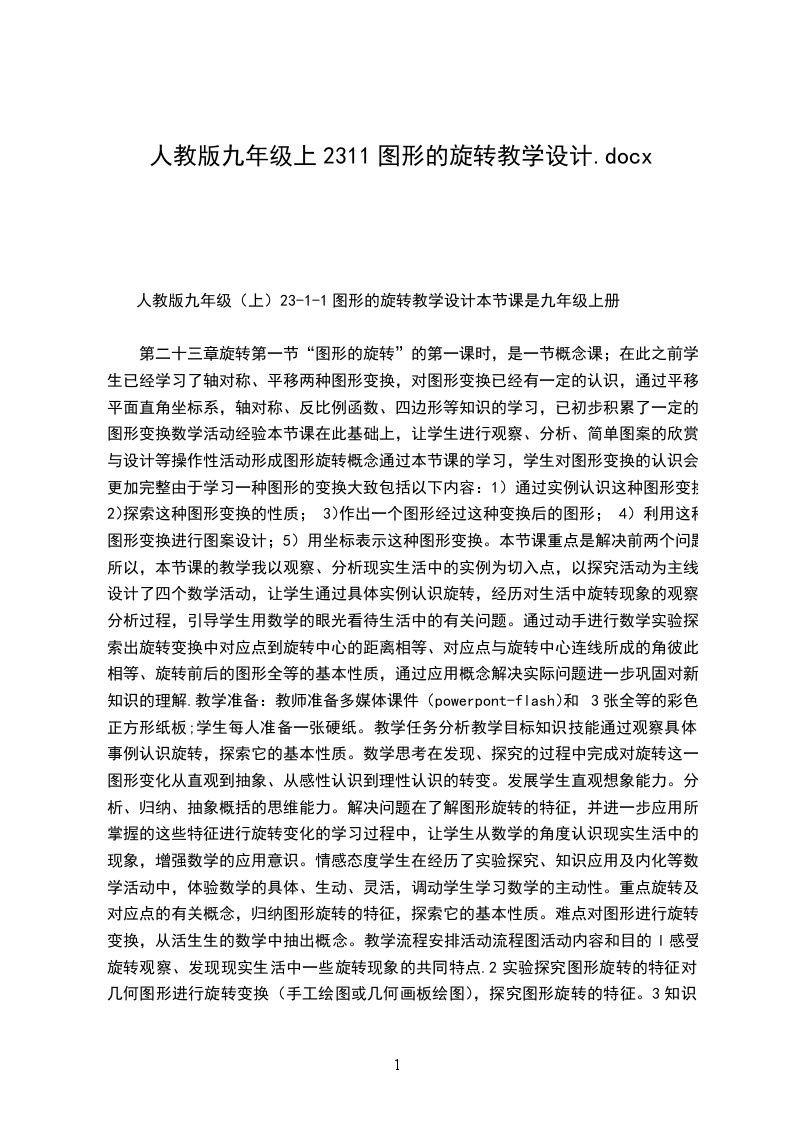 1、教学前在百度中搜索有关“图形的旋转”的资料,并对其进行选择、整理,确定课堂教学形式和方法,制成课件用于课堂教学。