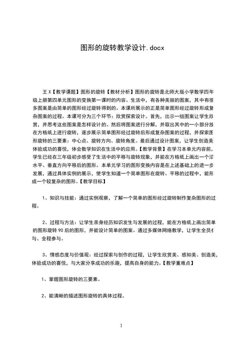 王X【教学课题】图形的旋转【教材分析】图形的旋转是北师大版小学数学四年级上册第四单元图形的变换第一课时的内容。生活中,有各种美丽的图案,其中有很多图案是由简单的图形经过旋转得到的。本课所展示的正是简单图形经过旋转形成复杂图案的过程。本课可分为三个环节:欣赏探索设计。首先,出示一组图案让学生欣赏,并思考这些图案是怎样设计的。然后将图案进行分解,并取出其中的一小部分放在方格纸上进行旋转,逐步展示简单图形经过旋转后形成复杂图案的过程,并探索图形旋转的三要素:中心点、旋转方向、旋转角度。最后通过设计图案,让学生创造美,体验成功的喜悦,体会数学知识在生活中的应用。【教学背景】在学习本单元内容前,学生已经在三年级初步感受了生活中的平移与旋转现象,并能在方格纸上画出一个沿水平、垂直方向平移后的图形。本单元学习的图形变换内容是在上述基础上的进一步发展,通过具体实例的展示,使学生知道一个简单图形在旋转、平移的过程中,能形成一个较复杂的图形。【教学目标】