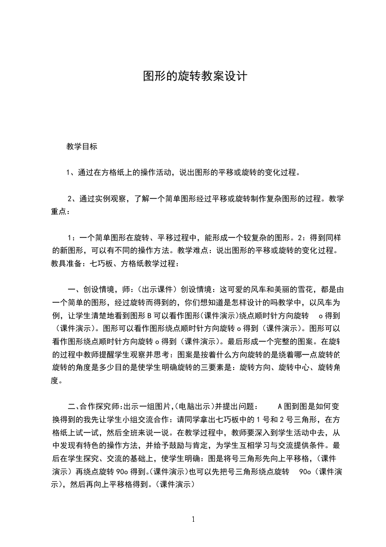 一、创设情境、导入新课师:同学们,你们玩过风车吗?(玩过),你知道风车的运动方式是什么吗?(旋转)。(出示课件、两个按不同方向旋转的风车)请同学们仔细观察,这两个风车旋转时有什么相同的地方?有什么不同的地方?
