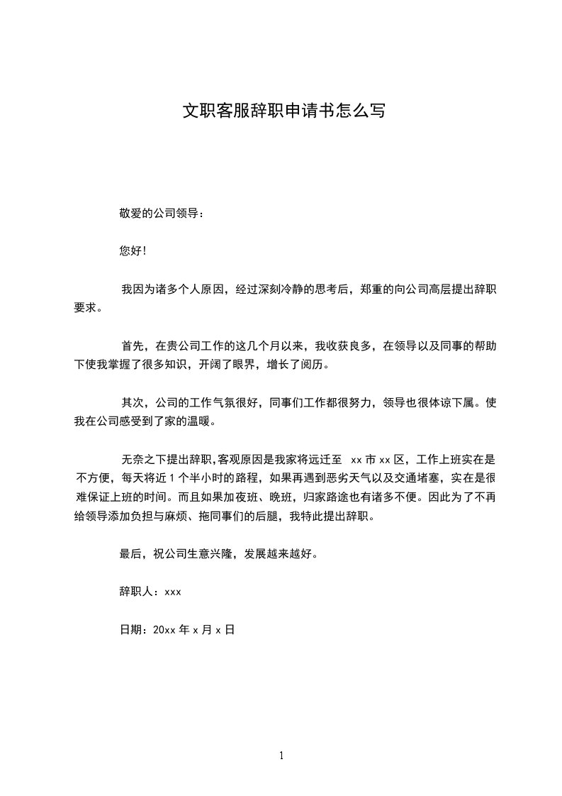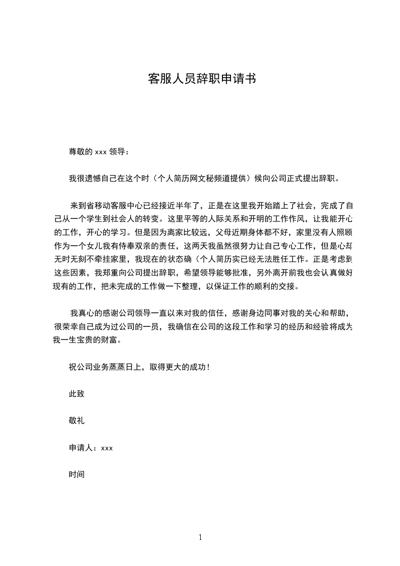 来到省移动客服中心已经接近半年了,正是在这里我开始踏上了社会,完成了自己从一个学生到社会人的转变。这里平等的人际关系和开明的工作作风,让我能开心的工作,开心的学习。但是因为离家比较远,父母近期身体都不好,家里没有人照顾,作为一个女儿我有侍奉双亲的责任,这两天我虽然很努力让自己专心工作,但是心却无时无刻不牵挂家里,我现在的状态确(个人简历实已经无法胜任工作。正是考虑到这些因素,我郑重向公司提出辞职,希望领导能够批准,另外离开前我也会认真做好现有的工作,把未完成的工作做一下整理,以保证工作的顺利的交接。