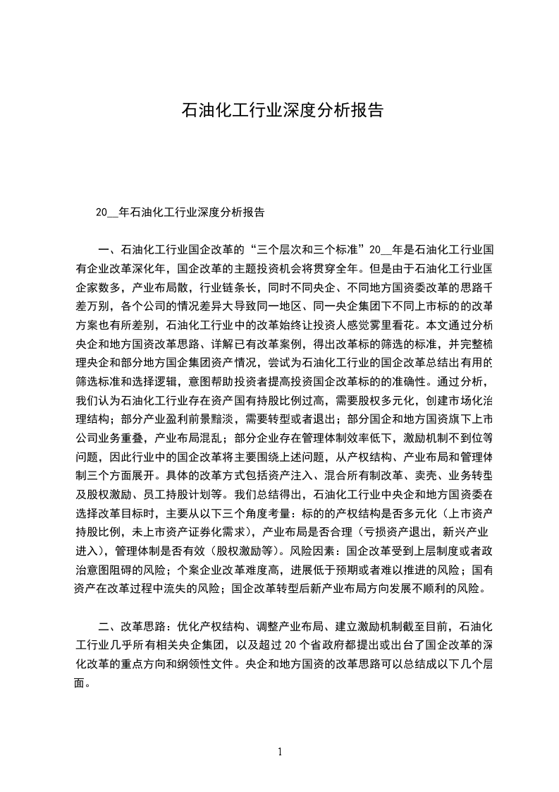 一、石油化工行业国企改革的“三个层次和三个标准”20__年是石油化工行业国有企业改革深化年,国企改革的主题投资机会将贯穿全年。但是由于石油化工行业国企家数多,产业布局散,行业链条长,同时不同央企、不同地方国资委改革的思路千差万别,各个公司的情况差异大导致同一地区、同一央企集团下不同上市标的的改革方案也有所差别,石油化工行业中的改革始终让投资人感觉雾里看花。本文通过分析央企和地方国资改革思路、详解已有改革案例,得出改革标的筛选的标准,并完整梳理央企和部分地方国企集团资产情况,尝试为石油化工行业的国企改革总结出有用的筛选标准和选择逻辑,意图帮助投资者提高投资国企改革标的的准确性。通过分析,我们认为石油化工行业存在资产国有持股比例过高,需要股权多元化,创建市场化治理结构;部分产业盈利前景黯淡,需要转型或者退出;部分国企和地方国资旗下上市公司业务重叠,产业布局混乱;部分企业存在管理体制效率低下,激励机制不到位等问题,因此行业中的国企改革将主要围绕上述问题,从产权结构、产业布局和管理体制三个方面展开。具体的改革方式包括资产注入、混合所有制改革、卖壳、业务转型及股权激励、员工持股计划等。我们总结得出,石油化工行业中央企和地方国资委在选择改革目标时,主要从以下三个角度考量:标的的产权结构是否多元化(上市资产持股比例,未上市资产证券化需求),产业布局是否合理(亏损资产退出,新兴产业进入),管理体制是否有效(股权激励等)。风险因素:国企改革受到上层制度或者政治意图阻碍的风险;个案企业改革难度高,进展低于预期或者难以推进的风险;国有资产在改革过程中流失的风险;国企改革转型后新产业布局方向发展不顺利的风险。