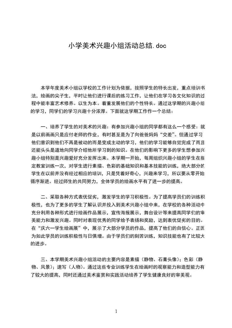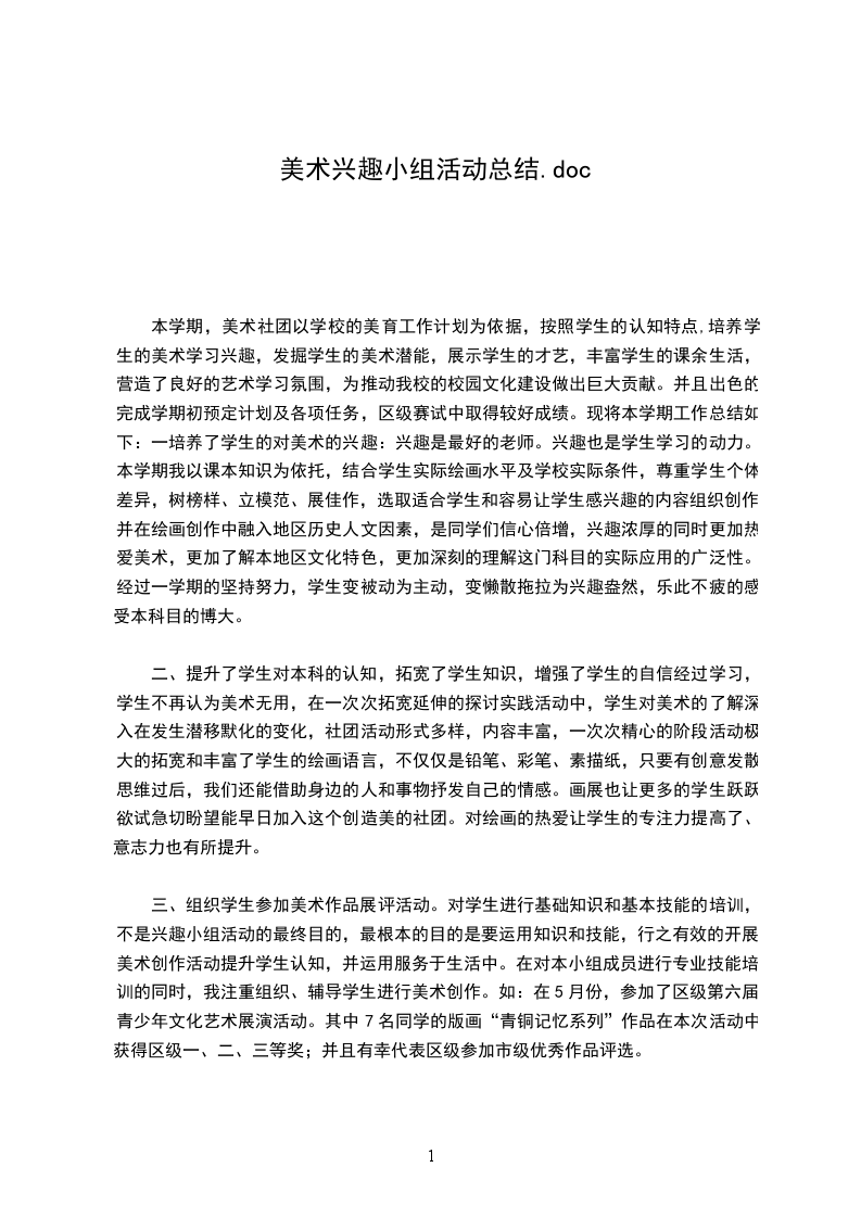 本学期,美术社团以学校的美育工作计划为依据,按照学生的认知特点,培养学生的美术学习兴趣,发掘学生的美术潜能,展示学生的才艺,丰富学生的课余生活,营造了良好的艺术学习氛围,为推动我校的校园文化建设做出巨大贡献。并且出色的完成学期初预定计划及各项任务,区级赛试中取得较好成绩。现将本学期工作总结如下:一培养了学生的对美术的兴趣:兴趣是最好的老师。兴趣也是学生学习的动力。本学期我以课本知识为依托,结合学生实际绘画水平及学校实际条件,尊重学生个体差异,树榜样、立模范、展佳作,选取适合学生和容易让学生感兴趣的内容组织创作,并在绘画创作中融入地区历史人文因素,是同学们信心倍增,兴趣浓厚的同时更加热爱美术,更加了解本地区文化特色,更加深刻的理解这门科目的实际应用的广泛性。经过一学期的坚持努力,学生变被动为主动,变懒散拖拉为兴趣盎然,乐此不疲的感受本科目的博大。