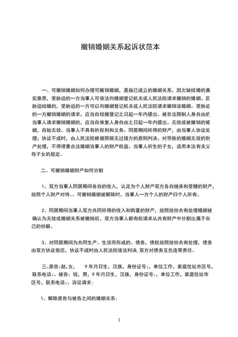 三、原告:赵,女,9年月日生,汉族,身份证号:,单位工作,家庭住址市区号,联系电话:。被告:钱,男,9年月日生,汉族,身份证号:,单位工作,家庭住址市区号,联系电话:。诉讼请求:
