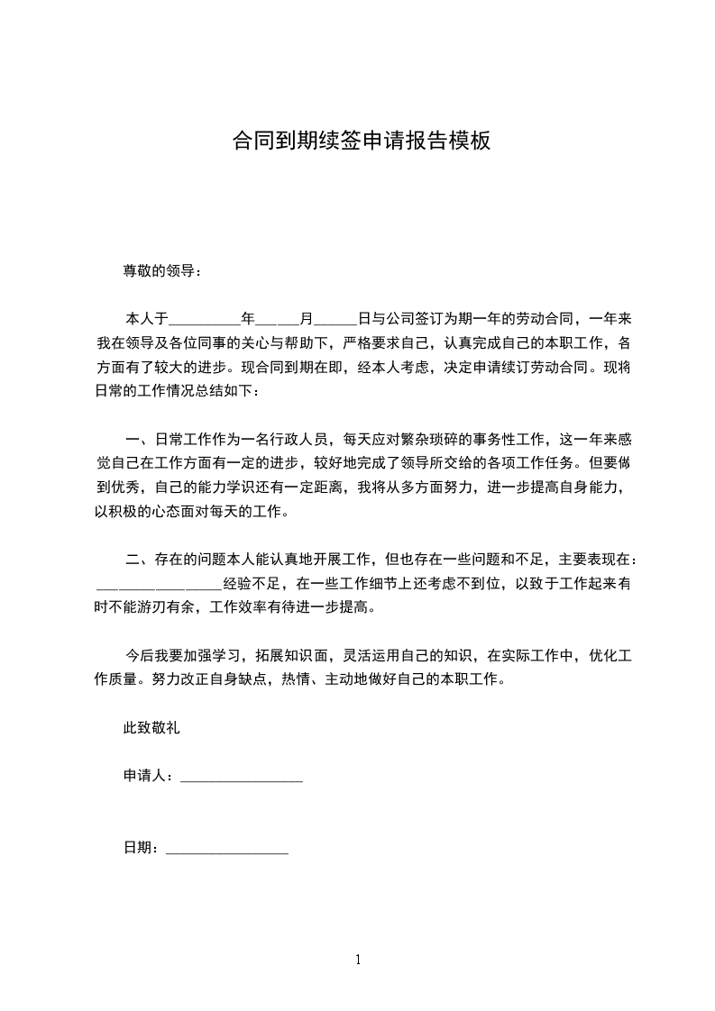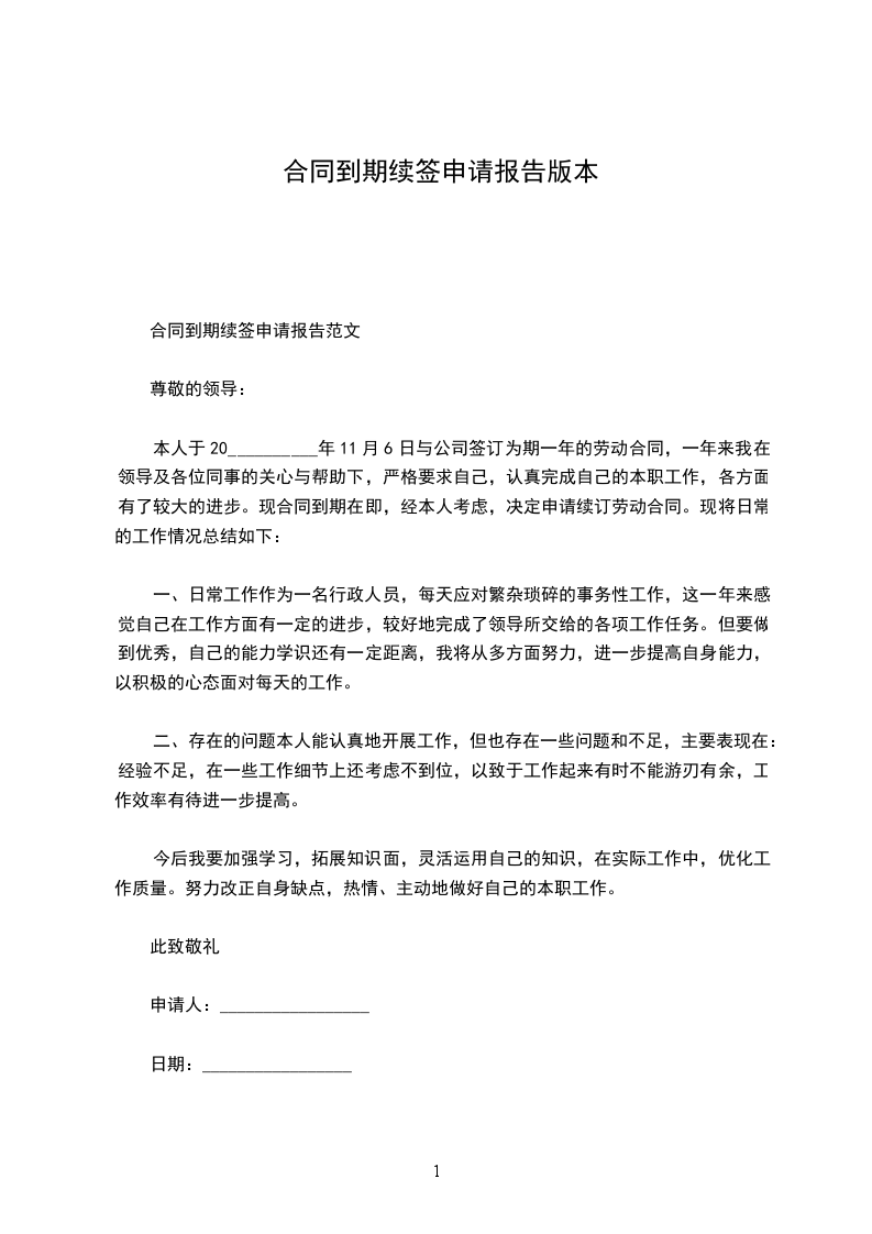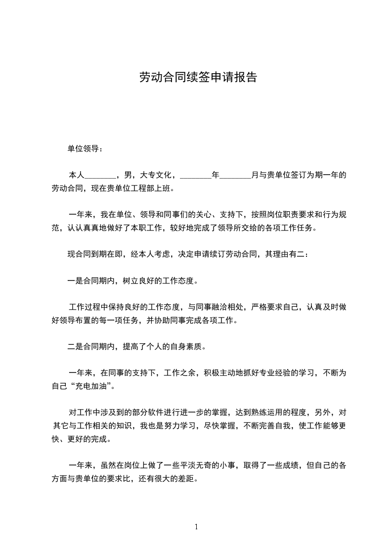本人于__________年______月______日与公司签订为期一年的劳动合同,一年来我在领导及各位同事的关心与帮助下,严格要求自己,认真完成自己的本职工作,各方面有了较大的进步。现合同到期在即,经本人考虑,决定申请续订劳动合同。现将日常的工作情况总结如下: