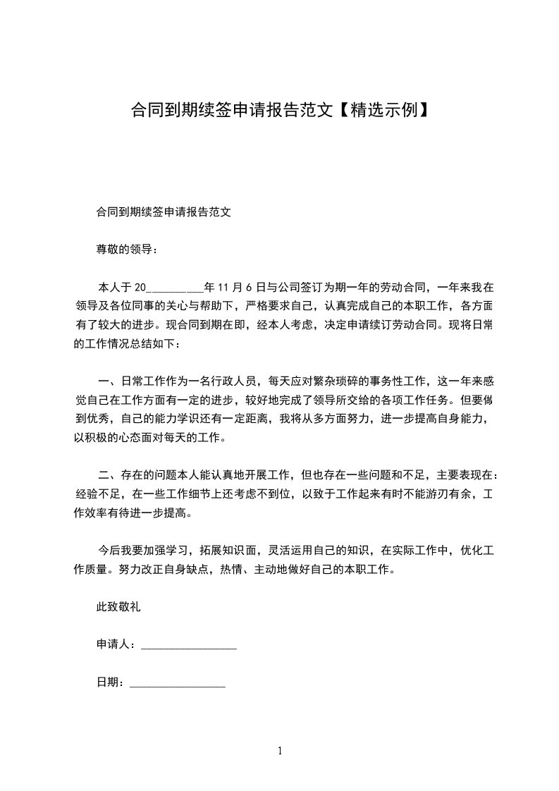 本人于__________年______月______日与公司签订为期一年的劳动合同,一年来我在领导及各位同事的关心与帮助下,严格要求自己,认真完成自己的本职工作,各方面有了较大的进步。现合同到期在即,经本人考虑,决定申请续订劳动合同。现将日常的工作情况总结如下: