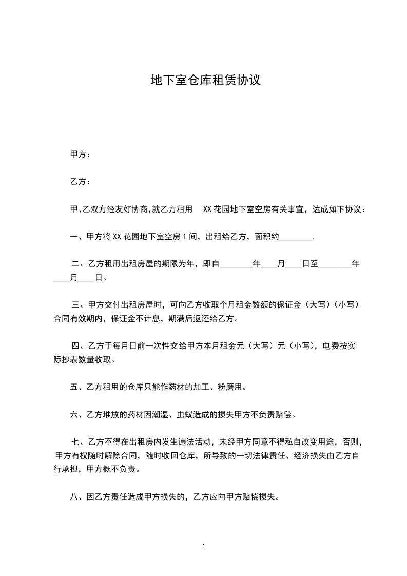 一、甲方将XX花园地下室空房1间,出租给乙方,面积约________.