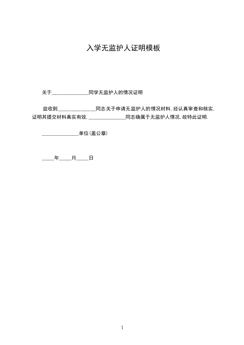 兹收到_______________同志关于申请无监护人的情况材料,经认真审查和核实,证明其提交材料真实有效,_______________同志确属于无监护人情况,故特此证明.