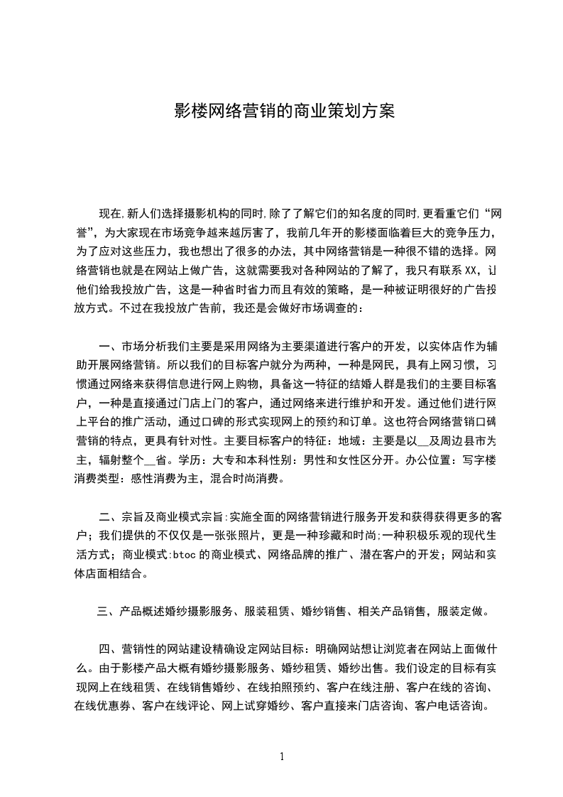 一、市场分析我们主要是采用网络为主要渠道进行客户的开发,以实体店作为辅助开展网络营销。所以我们的目标客户就分为两种,一种是网民,具有上网习惯,习惯通过网络来获得信息进行网上购物,具备这一特征的结婚人群是我们的主要目标客户,一种是直接通过门店上门的客户,通过网络来进行维护和开发。通过他们进行网上平台的推广活动,通过口碑的形式实现网上的预约和订单。这也符合网络营销口碑营销的特点,更具有针对性。主要目标客户的特征:地域:主要是以__及周边县市为主,辐射整个__省。学历:大专和本科性别:男性和女性区分开。办公位置:写字楼。消费类型:感性消费为主,混合时尚消费。