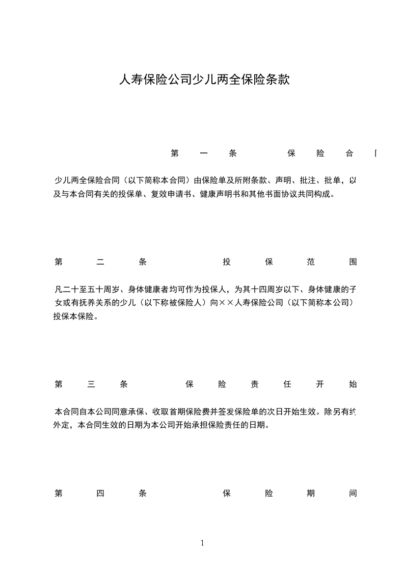 凡二十至五十周岁、身体健康者均可作为投保人,为其十四周岁以下、身体健康的子女或有抚养关系的少儿(以下称被保险人)向××人寿保险公司(以下简称本公司)投保本保险。