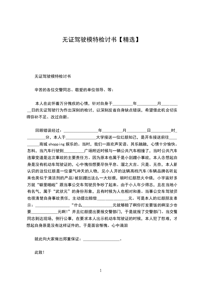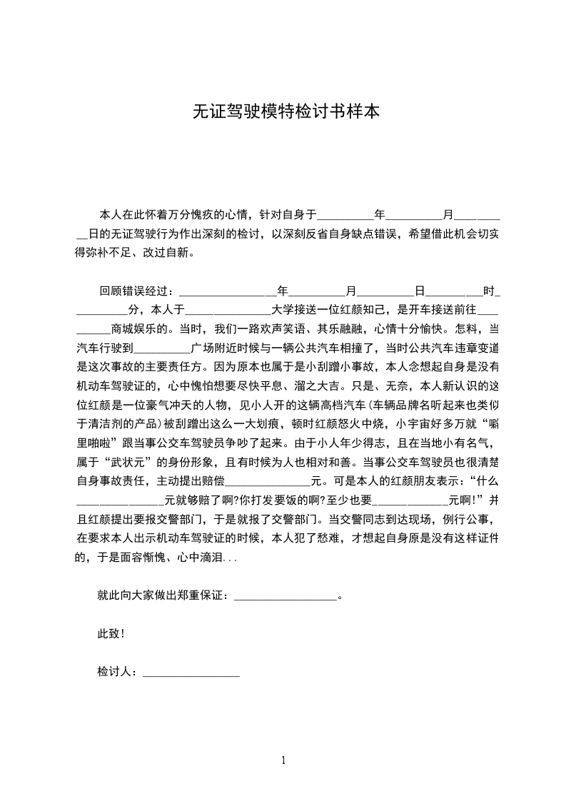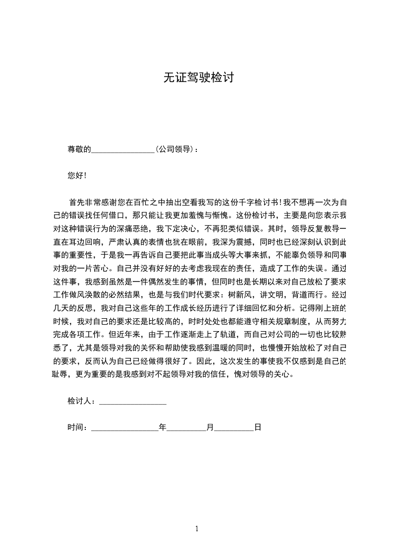 本人在此怀着万分愧疚的心情,针对自身于__________年__________月__________日的无证驾驶行为作出深刻的检讨,以深刻反省自身缺点错误,希望借此机会切实得弥补不足、改过自新。