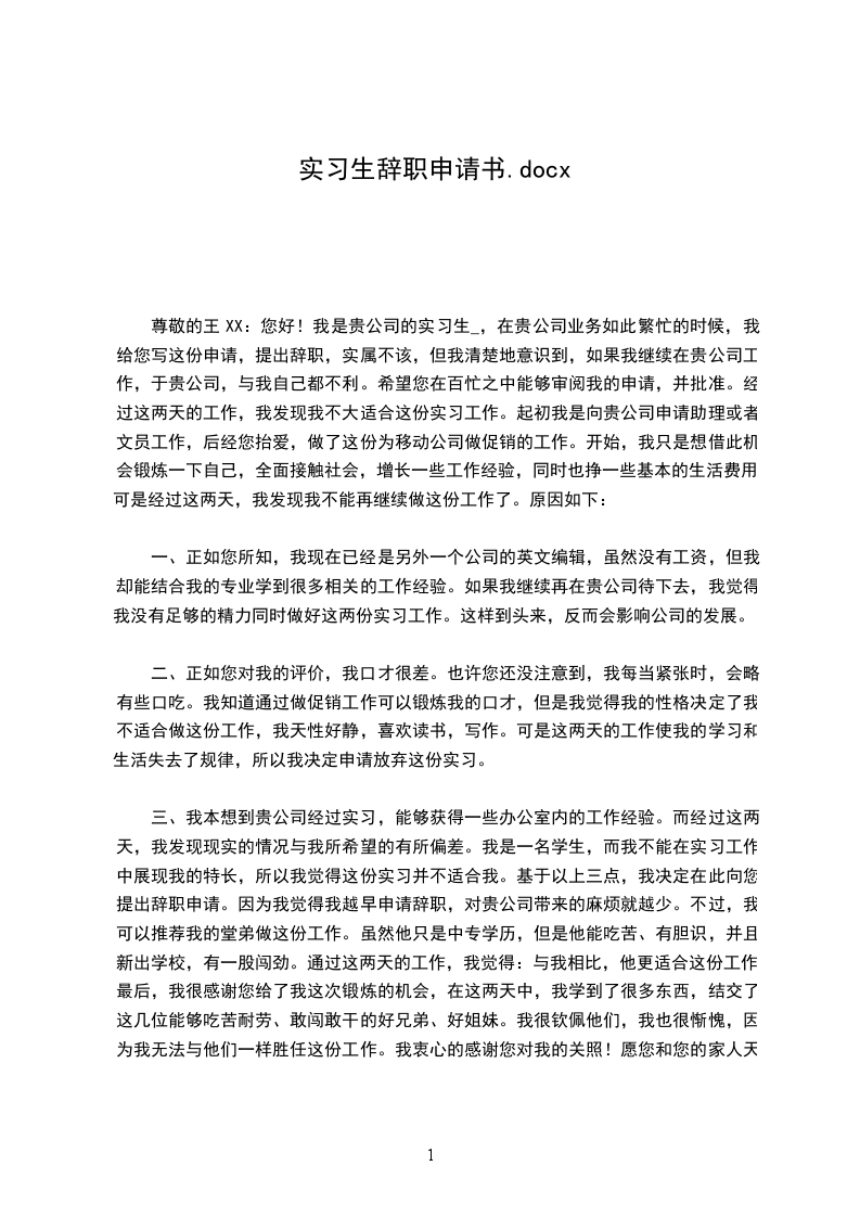 4、最后加上毕业答辩及毕业设计等诸多问题,我经过慎重考虑,决定回校处理这些事情,希望公司能够谅解。能为公司效力的日子不多了,我一定会把好自己最后一班岗,做好自己的本分工作,安安心心的离开公司,离开这些曾经同甘共苦的同事,很舍不得,舍不得领导们的譐譐教诲,舍不得同事之间的那片真诚和友善。在这里我谢谢公司给我的这次机会,谢谢经理和夏_在各方面的指导,谢谢公司同事的关照与帮助,祝你们事业有成、心想事成。最后祝公司蓬勃发展,兴旺发达!此致敬礼!申请人:_ue_ila_年_月_日实习生辞职申请书通用模板2尊敬的各位老师:大家好!请允许我以这样的形式向你们表达最深的敬意和谢意,并申请辞职。辞职完全是由于我个人的原因,我觉得该为我3个月的图书馆实习生活划上完整的句号了。截止到昨天的最后一班,我顺利地完成了自己的职责,并在心中默默地向图书馆惜别。当然,这种离别只是一种工作关系的改变而已,我的心依然深深地维系着图书馆。今后,图书馆出现更多的将是我学习和求索的身影,我以同样的执着与热情期待我们的图书馆越建越好,能为学生们提供越来越多的服务。在此,我深深地感谢图书馆为我提供了这份工作,并感激阅览部老师3个月来对我的关怀与照顾。可以说,图书馆在我最困难的时候给了我恰到好处的帮助,使我渐渐地在惠大适应过来,并不断地学习成长。图书馆简直就是我的衣食父母,这不仅是生活上的,还有学习上和精神上的。最后,无论多么不舍得,孩子长大了终究是要离开父母的,他必须学会独立地面对生活。而我,也终究要学会面对离别。各位老师,可能有点辜负你们的期待了,你们都希望我能做完这个学期,但我却在此时退出,为此我深感歉意。实因一张张新的面孔的出现,一张张熟悉的面孔离开,图书馆实习工作已经顺利地实现了级际替换,我也应该把机会留给更需要的人。如果因为我的离开而给各位老师带来什么不便的话,也只好敬请各位老师的原谅,我只能抱歉地说一声“老师辛苦了!”,我会在心中一直感谢你们的,感谢你们在我的人生旅途中,送给了我那么多。我暂时无以为报,只能祝福各位:“好人一生平安!”。谢谢!此致敬礼!申请人:_ue_ila_年_月_日实习生辞职申请书通用模板3尊敬的领导:您们好!首先致以我深深地歉意,怀着及其复杂而愧疚的心情我写下这一封辞职信,很遗憾自己在这个时候突然向公司提出辞职,纯粹是出于个人的原因,不能在公司继续工作不能与公司共同发展进步!时间过的很快,转眼间在公司已有将近半年的时间,也到了我毕业的时间,几个之前共同考研一战失利的同学相继共同思索将来,最终决定一起复习再考一年。而如果边工作边复习看书的话,怕会即影响工作的效率又影响复习的效率,所以经过深思熟虑后还是决定辞去工作全心复习考研。在公司实习上班是我人生中第一份全职工作,很感谢公司能提供给我这样一个实习的机会。在公司实习的这段时间里,不仅学习到很多的专业技能知识,还学到了更多的工作态度、为人处世态度等,为自己以后更好的从学校踏入社会打上了很好的基础。从刚开始在data组做数据收集工作学到了团队相互合作共同、合理分配任务提高工作效率,培养了好的工作态度;后来转到KPO组学习SAS、UNI-等专业数据挖掘和数据分析技能知识,接触数据分析项目,在同事的帮忙和教导下,让自己了解并学会使用了除SPSS软件之外更多的数据分析软件,把自己领入数据分析的门槛,为自己以后的职业生涯打好铺垫。为此,再次感谢公司提供了这样一个实习的机会给我,也感谢公司所有同事给予我的教导和照顾!我知道我的突然辞职会给公司造成不便,对此我深表抱歉。我已准备好在六月三十号辞职从公司离职,我将在这段时间里完成工作交接,以减少因我的离职而给公司带来的不便。在公司的这段经历于我而言非常珍贵。将来无论什么时候,我都会为自己曾经在公司实习而感到荣幸。我确信在公司的这段工作经历将是我整个职业生涯发展中相当重要的一部分。祝公司领导和所有同事身体健康、工作顺利!再次对我的离职给公司带来的不便表示抱歉,同时我也希望公司能够谅解,对我的申请予以考虑并批准。此致敬礼!申请人:_ue_ila_年_月_日实习生辞职申请书通用模板4尊敬的单位领导:您好!感谢您在百忙之中抽时间批阅我们的离职申请。现将我离职的一些原因向您做一个汇报。我于20-年5月20日进入单位参加实习工作,也十分感谢单位能够器重我,让我进入公司。然而通过这两个月零十天的工作生活,我逐渐意识到自己参加这份工作诸多的不合适与困难之处,有这么几点:一,我的实习工资很低,单位地址又距离学校很远,为此我不得不租房。然而租房的价格很高,想要租一个像样能够生活的房间开销太大,我无力承担。二,专业上存在偏差。我大学专业是金融财务管理,而实际工作是收银,两者偏差较大。三,工作量较大,我比较难以应付。这一段实际的收银工作量大,我有些难以应付,也因为工作粗心遭到了罚款处罚,这让我原本难堪的生活更是雪上加霜。为此,我单位领导递交工作离职申请。希望领导考虑我的实际困难情况,予以批准。此致敬礼!申请人:_ue_ila_年_月_日实习生辞职申请书通用模板5尊敬的经司人事部:您好!我很遗憾自己在这个时候想公司提出实习辞职。来公司也