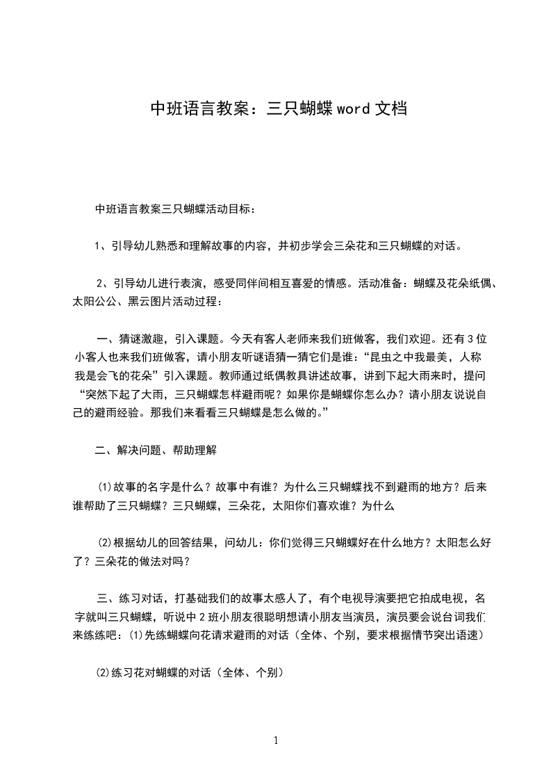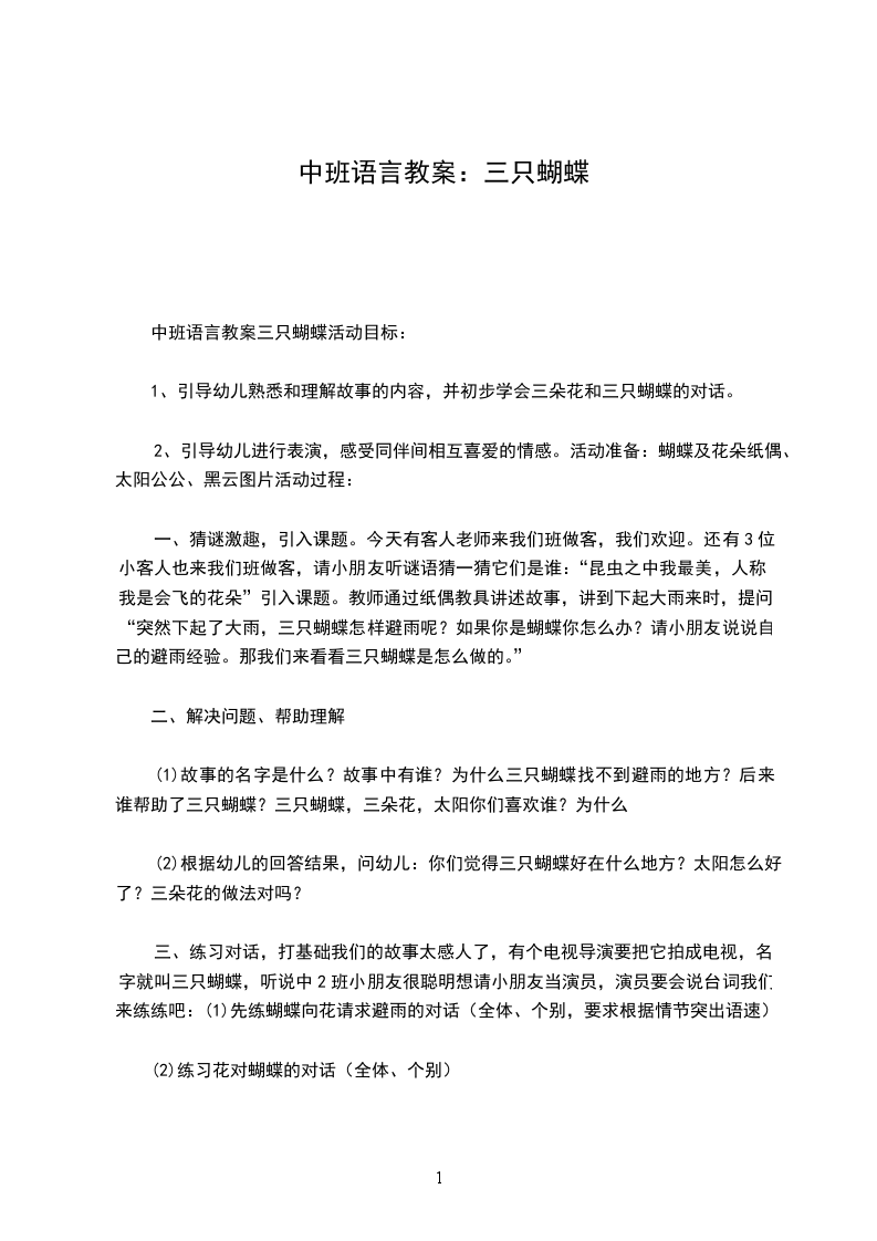 (1)故事的名字是什么?故事中有谁?为什么三只蝴蝶找不到避雨的地方?后来谁帮助了三只蝴蝶?三只蝴蝶,三朵花,太阳你们喜欢谁?为什么