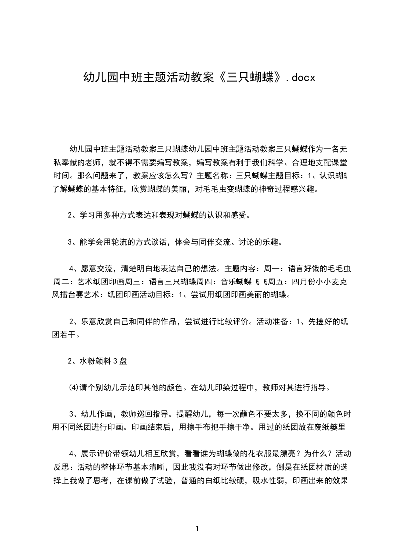 一、猜谜激趣,引入课题。今天有客人老师来我们班做客,我们欢迎。还有3位小客人也来我们班做客,请小朋友听谜语猜一猜它们是谁:“昆虫之中我最美,人称我是会飞的花朵”引入课题。教师通过纸偶教具讲述故事,讲到下起大雨来时,提问:“突然下起了大雨,三只蝴蝶怎样避雨呢?如果你是蝴蝶你怎么办?请小朋友说说自己的避雨经验。那我们来看看三只蝴蝶是怎么做的。”