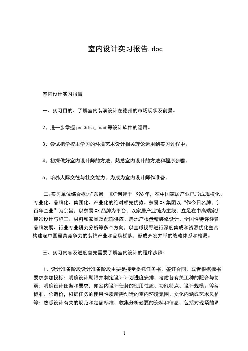二、实习单位综合概述“东易XX”创建于996年,在中国家居产业已形成规模化、专业化、品牌化、集团化、产业化的绝对领先优势。东易XX集团以“作今日名牌,创百年企业”为宗旨,以东易XX品牌为平台,以家居产业链为主线,立足在中高端家居装饰设计与施工、材料和家具及配饰供应、房地产楼盘精装修设计、全国性特许经营品牌发展、行业专业研究分析等多个方向,以全球视野进行深度集成和资源优化整合,构建起中国最具竞争力的装饰产业和品牌梯队,形成齐发并举的战略体系和格局。