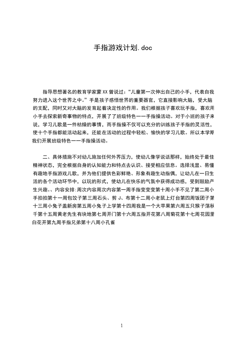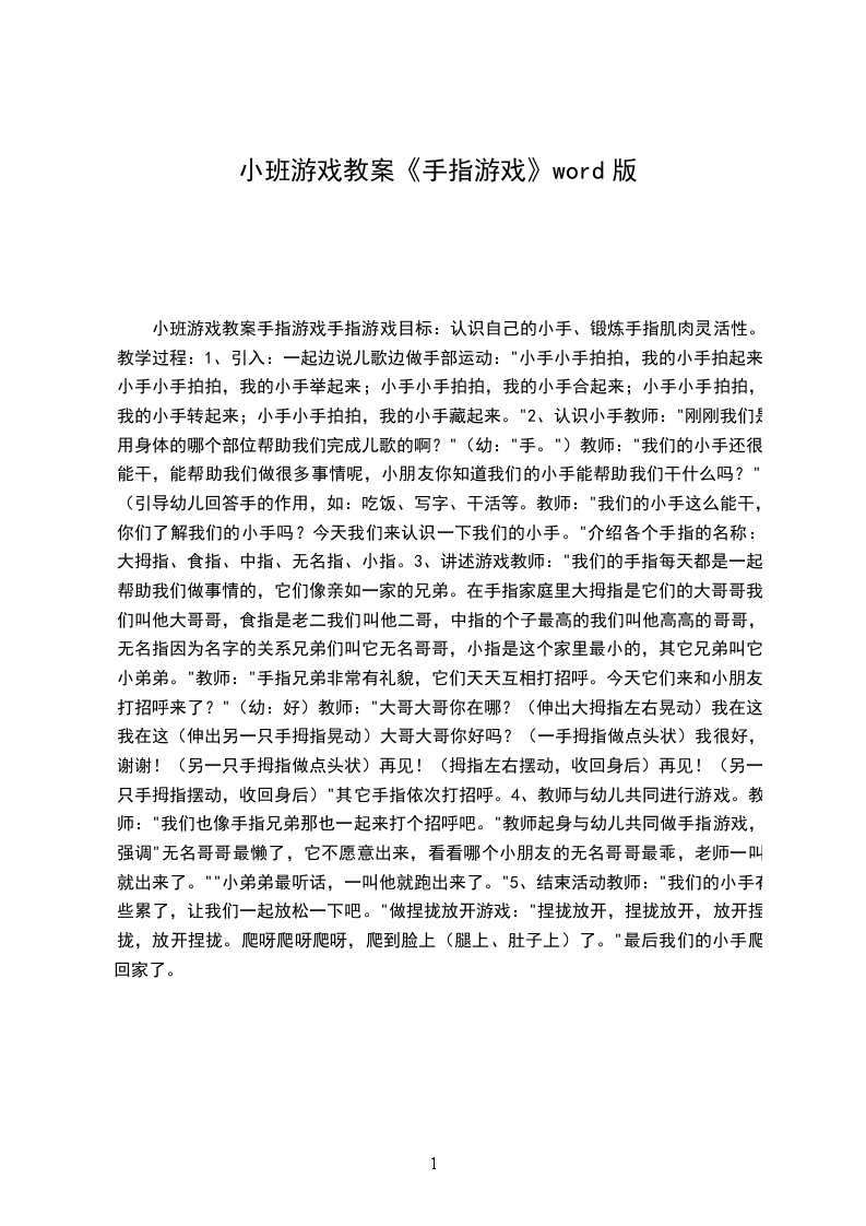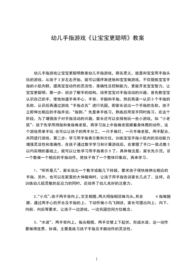 幼儿手指游戏让宝宝更聪明教案幼儿手指游戏,顾名思义,就是和宝宝用手指头玩的游戏。从孩子3岁左右开始,就可以循序渐进地和宝宝做游戏,不仅锻炼宝宝手指的小肌肉群,提高宝宝动作的灵活性、准确性及控制能力,更能开发宝宝智力,让宝宝更聪明。第一步:初步了解手的结构,培养宝宝对手指活动的兴趣。首先教宝宝认识自己的手,使他知道手有手心、手背、手腕和手指,然后再逐一认识5个手指的名称。认识后再通过游戏“手指点名”进行巩固,即家长说出一个手指的名称,孩子立即伸出相应的手指并说:“指到。”先是单手练习,熟练后用双手同时练习。在这个阶段,为了增强孩子对手指活动的兴趣,家长还可以安排他玩一些小游戏,如“小老鼠”:孩子先学用拇指和食指做老鼠,再学习加上中指做老鼠顺着身体爬的动作,这个游戏用单手玩;也可以让孩子的两手分工,一只手做灯,一只手做老鼠,两手配合,共同进行游戏。第二步:学习用手指表示数和方位,训练宝宝手指小肌肉的活动能力,增强灵活性和准确性。在孩子通过数字学习和计算游戏后,在掌握了手口一致点数5以内实物的基础上,就可以让他学习用手指表示5了。具体做法是:家长先示范,说一个数做一个相应的手指动作,使孩子有了一个整体印象后,再来学习。
