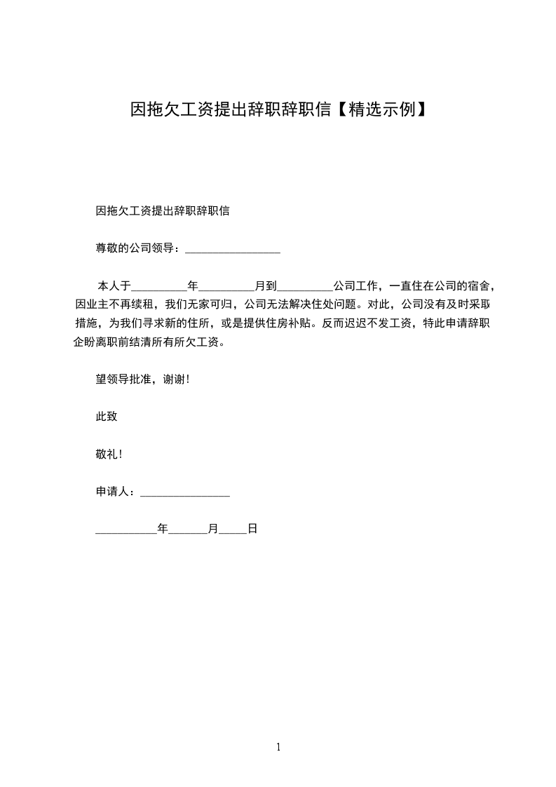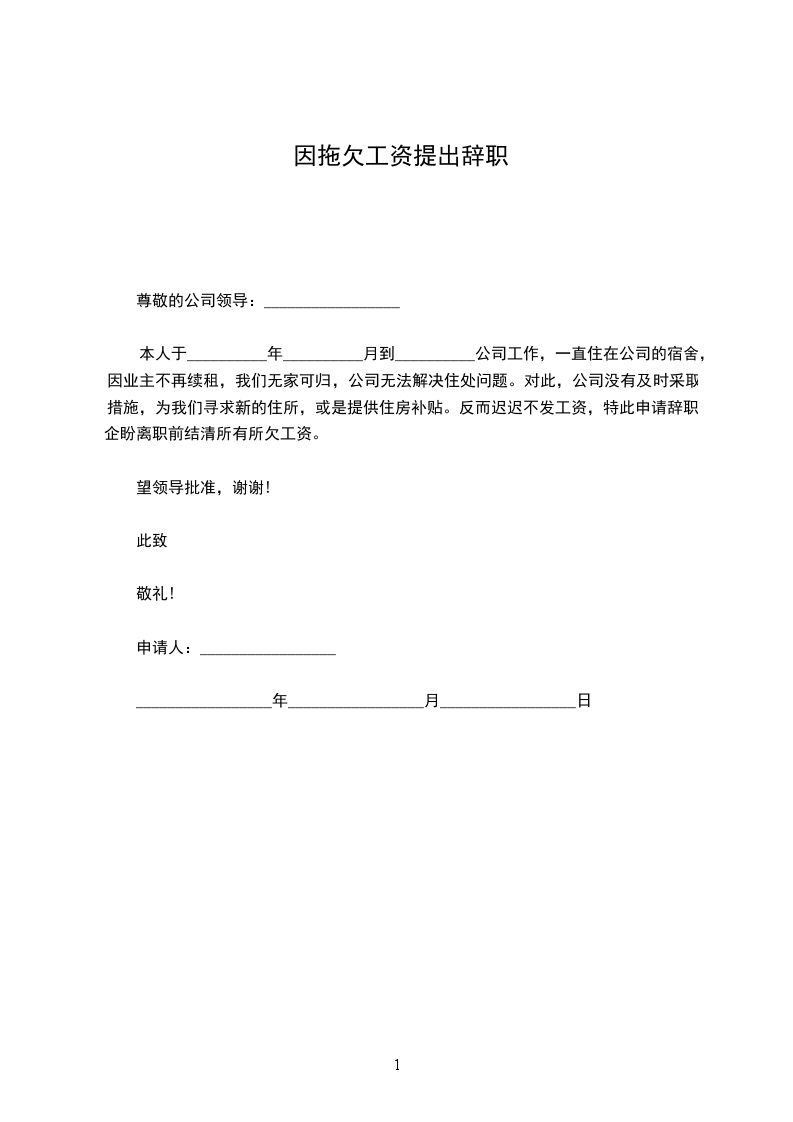 本人于__________年__________月到__________公司工作,一直住在公司的宿舍,因业主不再续租,我们无家可归,公司无法解决住处问题。对此,公司没有及时采取措施,为我们寻求新的住所,或是提供住房补贴。反而迟迟不发工资,特此申请辞职。企盼离职前结清所有所欠工资。