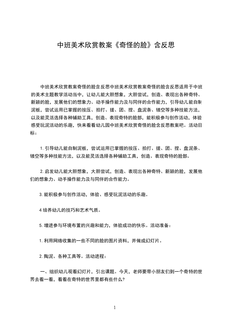 中班美术欣赏教案奇怪的脸含反思中班美术欣赏教案奇怪的脸含反思适用于中班的美术主题教学活动当中,让幼儿能大胆想象,大胆尝试,创造、表现出各种奇特、新颖的脸,发展他们的想象力、动手操作能力及与同伴的合作能力,引导幼儿能自制泥板,尝试运用已掌握的按压、拍打、搓、团、捏、盘泥条、镂空等多种技能方法,以及能灵活选择各种辅助工具,创造、表现奇特的脸部,能积极参与创作活动,体验、感受玩泥活动的乐趣,快来看看幼儿园中班美术欣赏奇怪的脸含反思教案吧。活动目标: