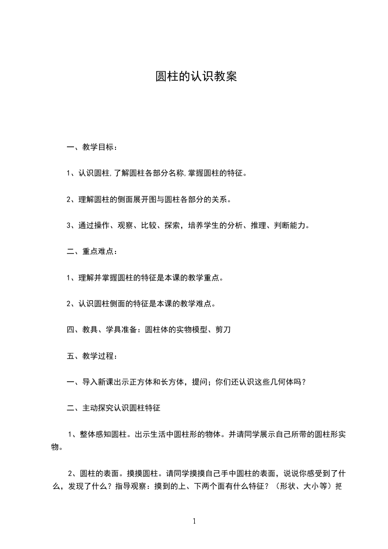 1、认识圆柱,了解圆柱各部分名称,掌握圆柱的特征。