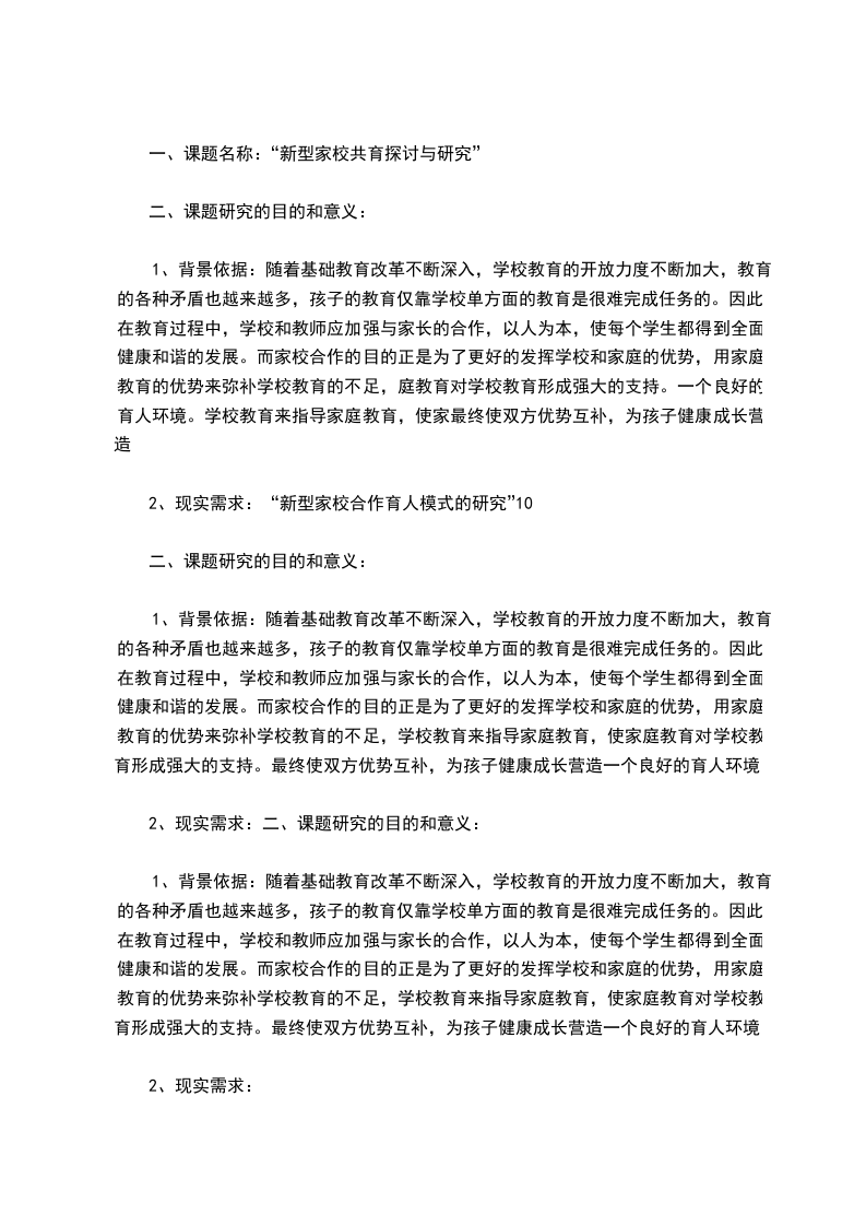 4、本课题研究的理论和学术价值:试图通过组织、实施“家校合作育人模式”的实施策略的构建,探索有效地开展家校活动的途径和方法,并进行初步的理论概括,丰富和拓展现代教学的操作性理论,促进现代教育教学理论向纵深发展。验学校“家庭合作育人模式”的研究提供成功的案例。