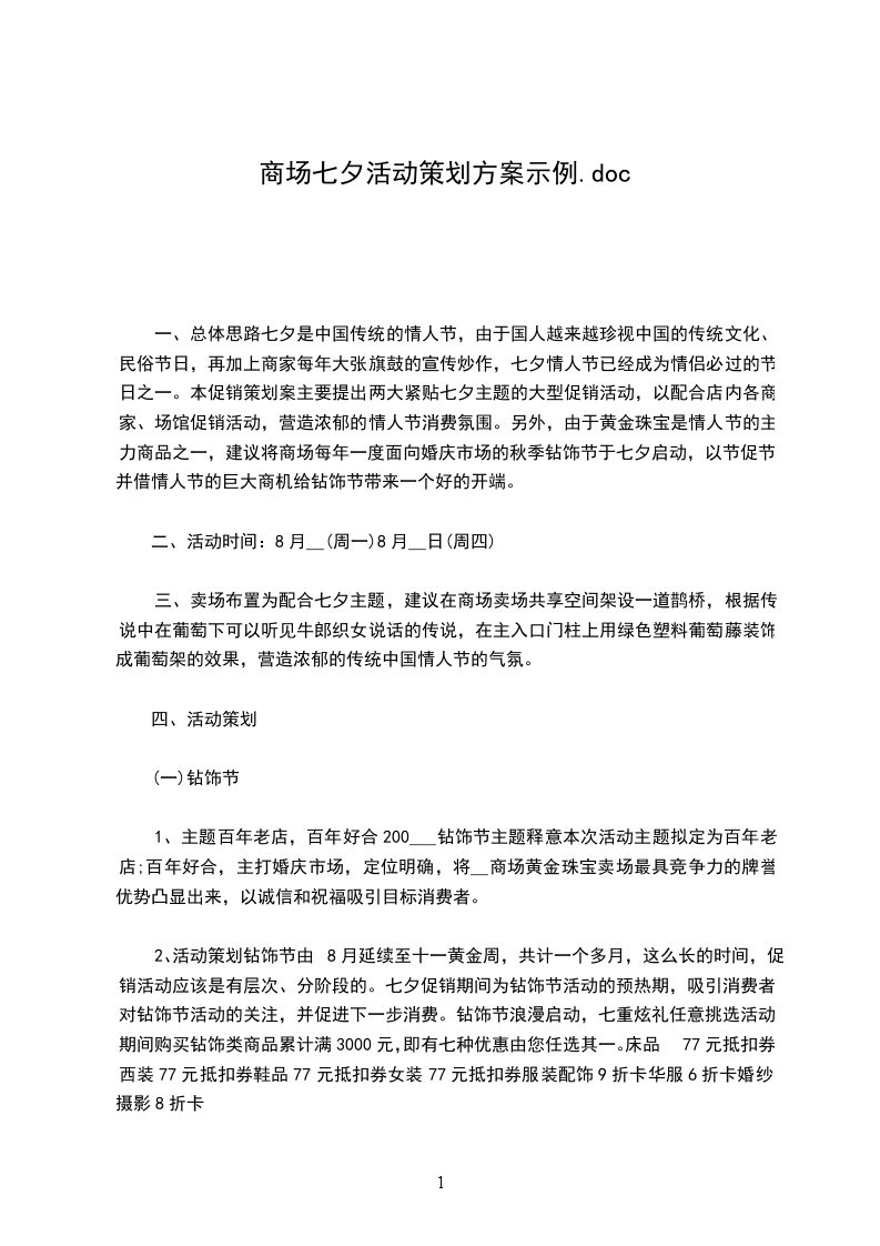 2、活动策划钻饰节由8月延续至十一黄金周,共计一个多月,这么长的时间,促销活动应该是有层次、分阶段的。七夕促销期间为钻饰节活动的预热期,吸引消费者对钻饰节活动的关注,并促进下一步消费。钻饰节浪漫启动,七重炫礼任意挑选活动期间购买钻饰类商品累计满3000元,即有七种优惠由您任选其一。床品77元抵扣券西装77元抵扣券鞋品77元抵扣券女装77元抵扣券服装配饰9折卡华服6折卡婚纱摄影8折卡