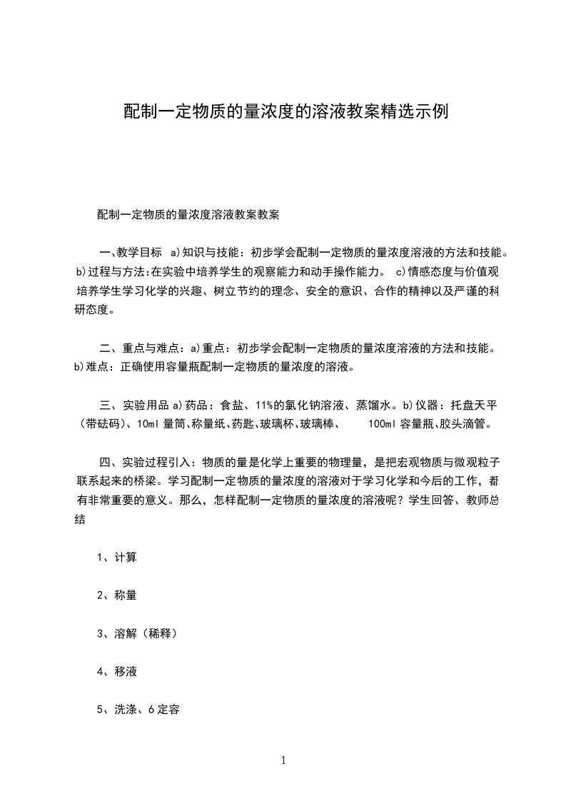 1.00填写学案mo的NaC溶液。【实验反思】你设想的配制过程与教材上分组做实验的一样吗?不一样的步骤有哪些?为什么要这样配?而不那样配?回忆为什么不直接在容量瓶中配制溶液?思考为什么要用蒸馏水洗涤烧杯,并把洗回想在实验涤液注入容量瓶?过程中失误为什么不能直接将溶液或蒸馏水注入的地方容量瓶,而要用玻璃棒引流。当液面离瓶颈刻度线1-2cm时,为什回答么改用胶头滴管?通过了解实际生如果将烧杯中的溶液转移至容量瓶时思考产中多种计量方不慎洒到容量瓶外,最后配成的溶液中分析法,使学生初步溶质的物质的量浓度比要求的大了还是回答学会从方便实小了?际需求”的角度教学环节3【提问】你认为确保物质的量浓度准确的去看待化学计量一定物质根本原则是什么?问题。的量浓度溶液的配制【小结】尽可能将溶质全部转移到容量瓶中。确保向容量瓶中加水时不超过瓶颈上的刻度线。【板书】误差分析【总结】通过本节课,你学到了什么?【补充】表示溶液浓度的方法很多绝不仅仅只有质量百分数和物质的量浓度两种,例如:(见教材P15化验单)。思考回答思考回答板书设计物质的量浓度