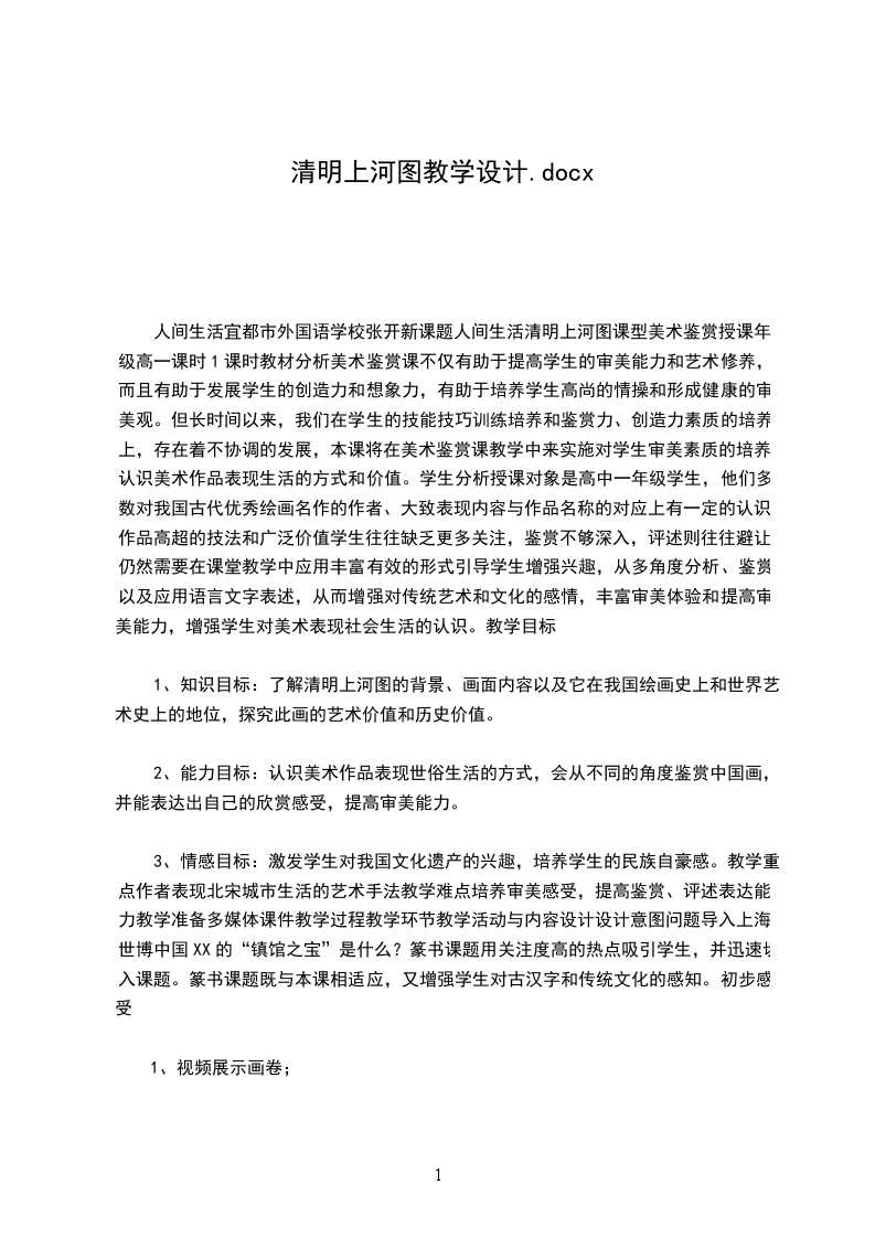 人间生活宜都市外国语学校张开新课题人间生活清明上河图课型美术鉴赏授课年级高一课时1课时教材分析美术鉴赏课不仅有助于提高学生的审美能力和艺术修养,而且有助于发展学生的创造力和想象力,有助于培养学生高尚的情操和形成健康的审美观。但长时间以来,我们在学生的技能技巧训练培养和鉴赏力、创造力素质的培养上,存在着不协调的发展,本课将在美术鉴赏课教学中来实施对学生审美素质的培养,认识美术作品表现生活的方式和价值。学生分析授课对象是高中一年级学生,他们多数对我国古代优秀绘画名作的作者、大致表现内容与作品名称的对应上有一定的认识,作品高超的技法和广泛价值学生往往缺乏更多关注,鉴赏不够深入,评述则往往避让,仍然需要在课堂教学中应用丰富有效的形式引导学生增强兴趣,从多角度分析、鉴赏以及应用语言文字表述,从而增强对传统艺术和文化的感情,丰富审美体验和提高审美能力,增强学生对美术表现社会生活的认识。教学目标