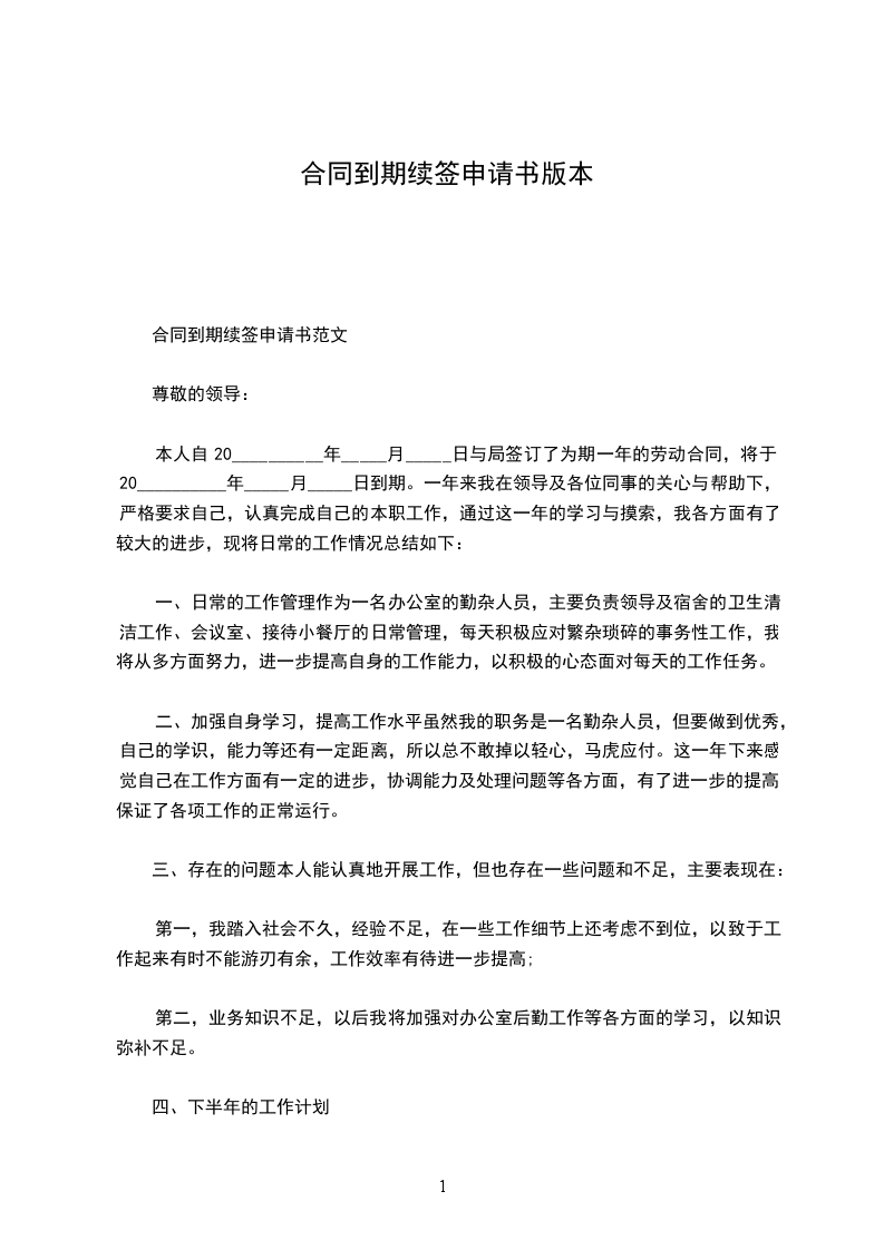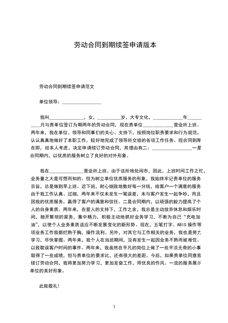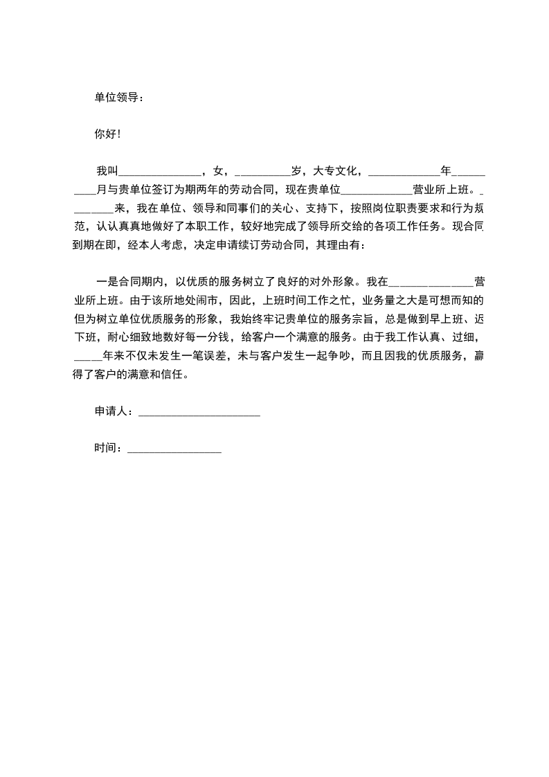 我叫_______________,女,__________岁,大专文化,_____________年__________月与贵单位签订为期两年的劳动合同,现在贵单位_____________营业所上班。________来,我在单位、领导和同事们的关心、支持下,按照岗位职责要求和行为规范,认认真真地做好了本职工作,较好地完成了领导所交给的各项工作任务。现合同到期在即,经本人考虑,决定申请续订劳动合同,其理由有: