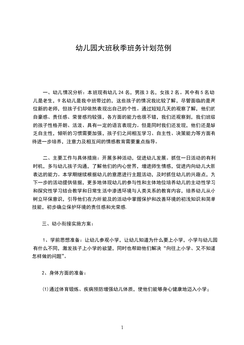 一、幼儿情况分析:本班现有幼儿24名,男孩3名,女孩2名。其中有5名幼儿是老生,9名幼儿是我中班带过的,这些孩子的情况我比较了解,尽管面临的是两位新的老师,但孩子们却依然表现出自己的个性。通过短短几天的观察了解,他们的自豪感、责任感、荣誉感均较强,各方面的能力也很不错,我们还观察到,我们班级的孩子性格开朗、活泼、具有一定的语言表现力。但是同时我们还发现,他们还是缺乏自主性,倾听的习惯需要加强,孩子们之间相互学习、自主性、决策能力等方面有待进一步培养,注意力及相互间的情感教育需要重点指导。