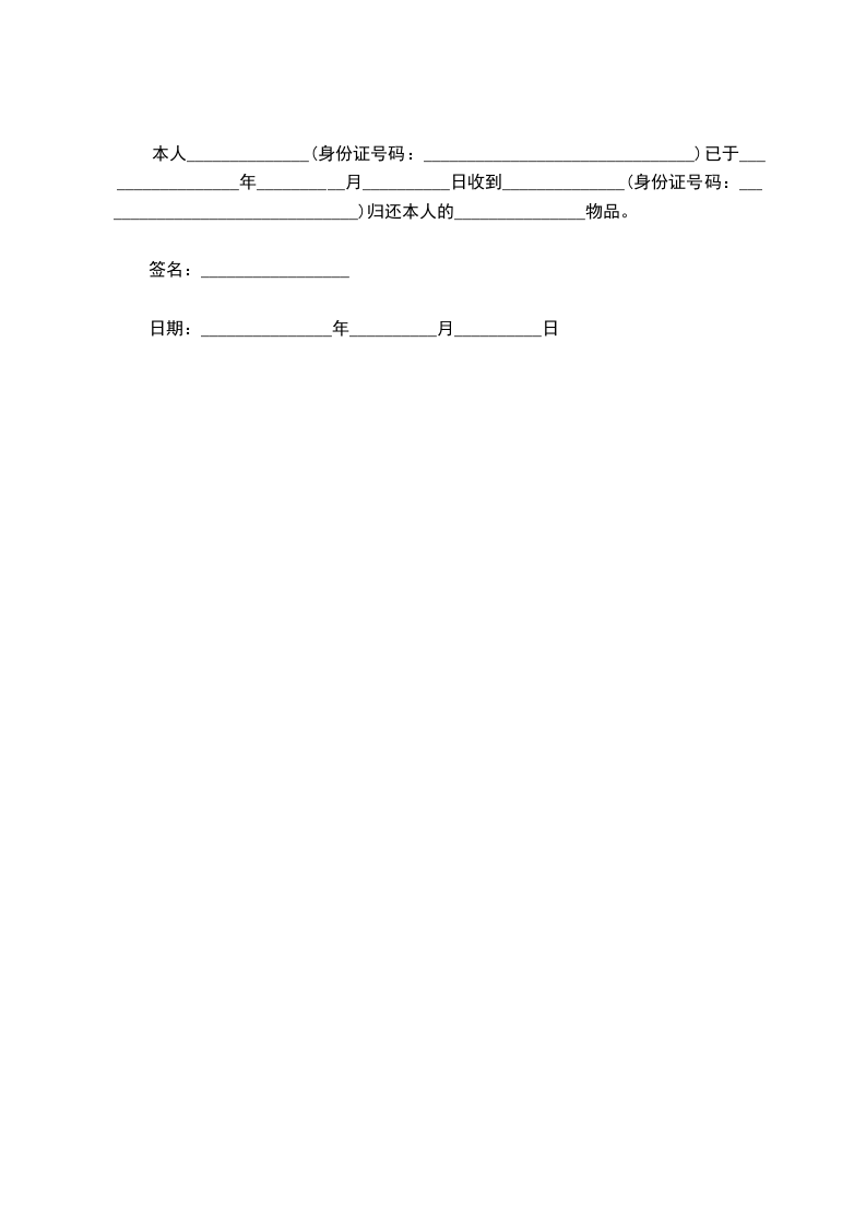 本人______________(身份证号码:_______________________________)已于_________________年__________月__________日收到______________(身份证号码:_______________________________)归还本人的_______________物品。