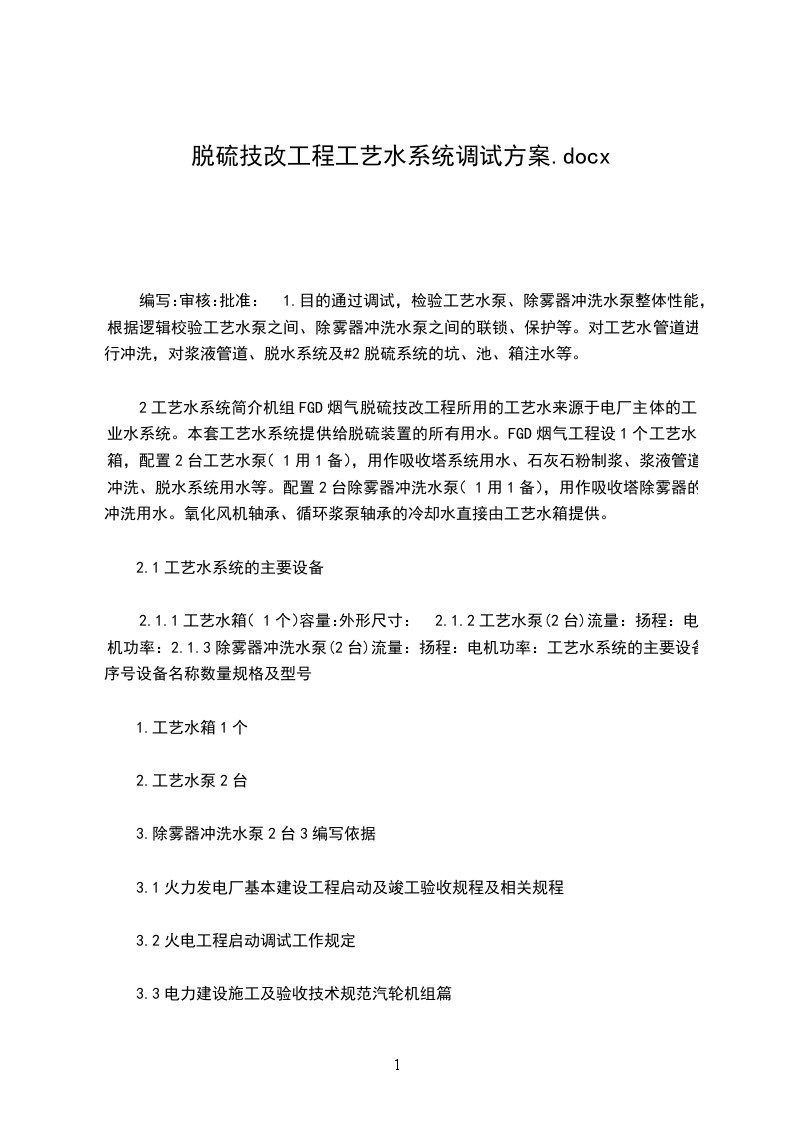 编写:审核:批准:1.目的通过调试,检验工艺水泵、除雾器冲洗水泵整体性能,根据逻辑校验工艺水泵之间、除雾器冲洗水泵之间的联锁、保护等。对工艺水管道进行冲洗,对浆液管道、脱水系统及#2脱硫系统的坑、池、箱注水等。